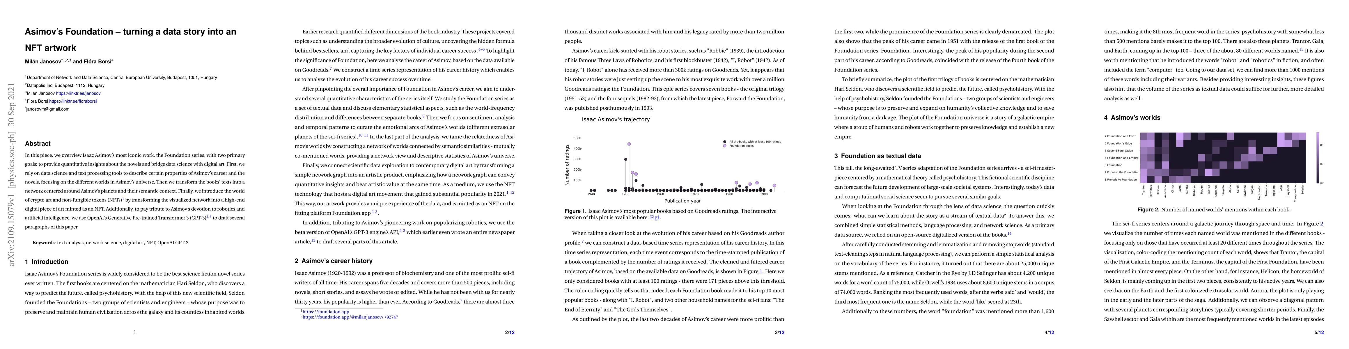 In this piece, we overview Isaac Asimov's most iconic work, the Foundation series, with two primary goals: to provide quantitative insights about the novels and bridge data science with digital art. First, we rely on data science and text processing tools to describe certain properties of Asimov's career and the novels, focusing on the different worlds in Asimov's universe. Then we transform the books' texts into a network centered around Asimov's planets and their semantic context. Finally, we introduce the world of crypto art and non-fungible tokens (NFTs) by transforming the visualized network into a high-end digital piece of art minted as an NFT. Additionally, to pay tribute to Asimov's devotion to robotics and artificial intelligence, we use OpenAI's Generative Pre-trained Transformer 3 (GPT-3) to draft several paragraphs of this paper.