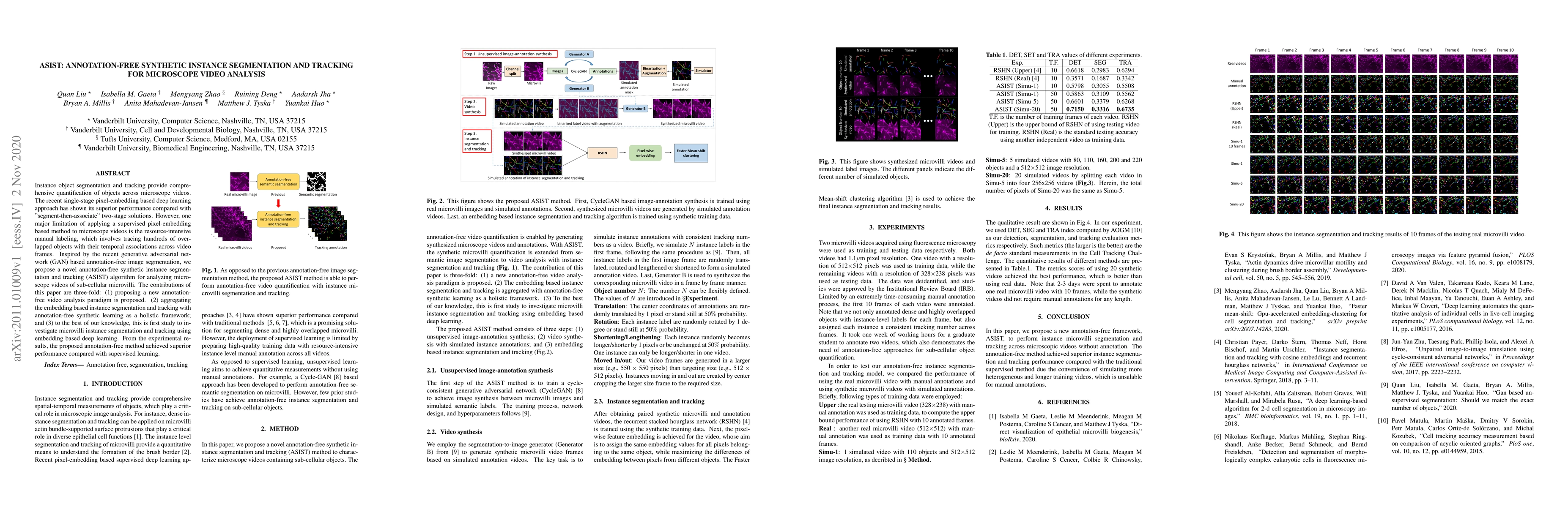 The paper proposes ASIST, an annotation-free synthetic instance segmentation and tracking algorithm for microscope video analysis, leveraging generative adversarial networks to eliminate the need for manual labeling. The ASIST framework combines embedding-based segmentation and tracking with synthetic learning, achieving superior performance compared to supervised methods.