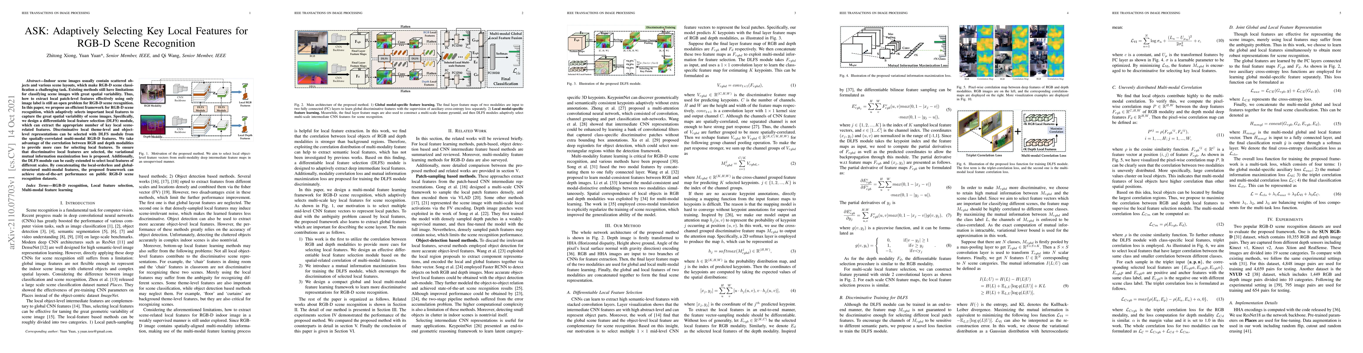 This paper proposes a framework for RGB-D scene recognition that adaptively selects key local features using a differentiable local feature selection module (DLFS). The DLFS module leverages variational mutual information maximization to extract discriminative features, enhancing performance on public datasets.
