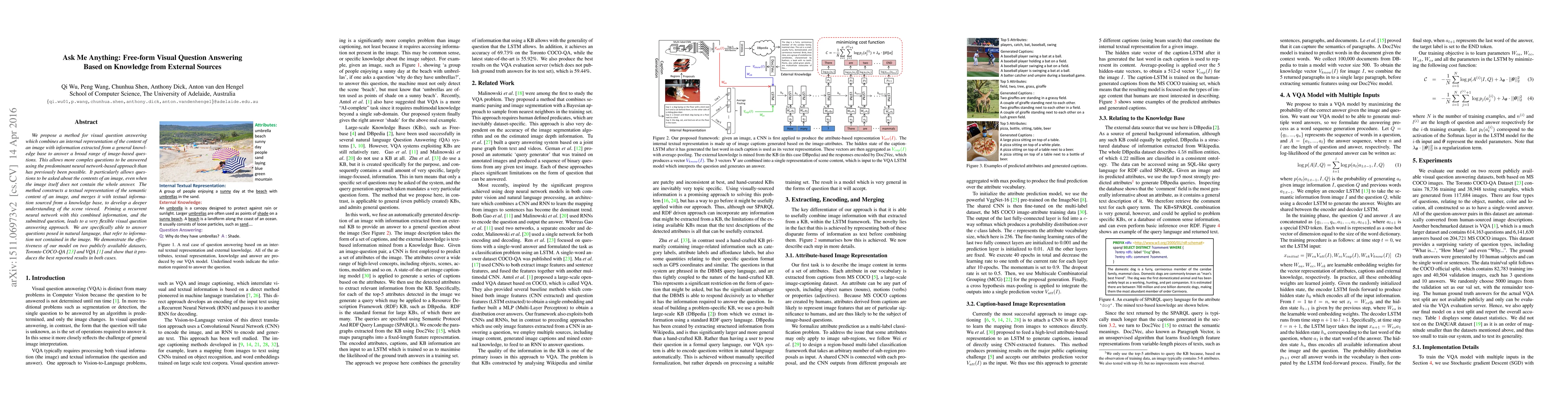 We propose a method for visual question answering which combines an internal representation of the content of an image with information extracted from a general knowledge base to answer a broad range of image-based questions. This allows more complex questions to be answered using the predominant neural network-based approach than has previously been possible. It particularly allows questions to be asked about the contents of an image, even when the image itself does not contain the whole answer. The method constructs a textual representation of the semantic content of an image, and merges it with textual information sourced from a knowledge base, to develop a deeper understanding of the scene viewed. Priming a recurrent neural network with this combined information, and the submitted question, leads to a very flexible visual question answering approach. We are specifically able to answer questions posed in natural language, that refer to information not contained in the image. We demonstrate the effectiveness of our model on two publicly available datasets, Toronto COCO-QA and MS COCO-VQA and show that it produces the best reported results in both cases.