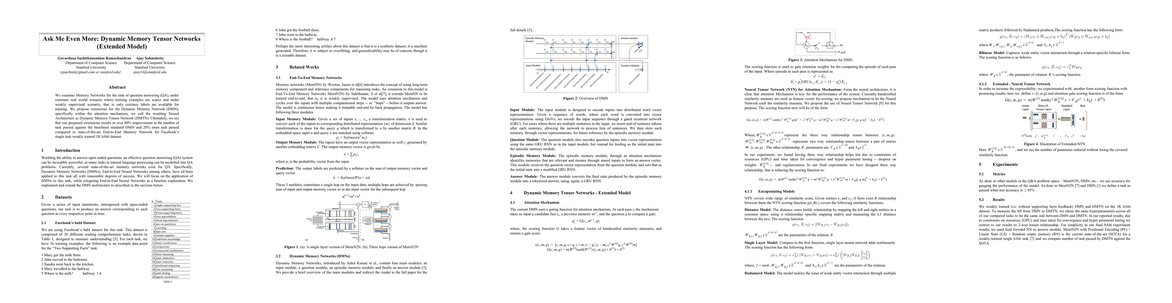We examine Memory Networks for the task of question answering (QA), under common real world scenario where training examples are scarce and under weakly supervised scenario, that is only extrinsic labels are available for training. We propose extensions for the Dynamic Memory Network (DMN), specifically within the attention mechanism, we call the resulting Neural Architecture as Dynamic Memory Tensor Network (DMTN). Ultimately, we see that our proposed extensions results in over 80% improvement in the number of task passed against the baselined standard DMN and 20% more task passed compared to state-of-the-art End-to-End Memory Network for Facebook's single task weakly trained 1K bAbi dataset.