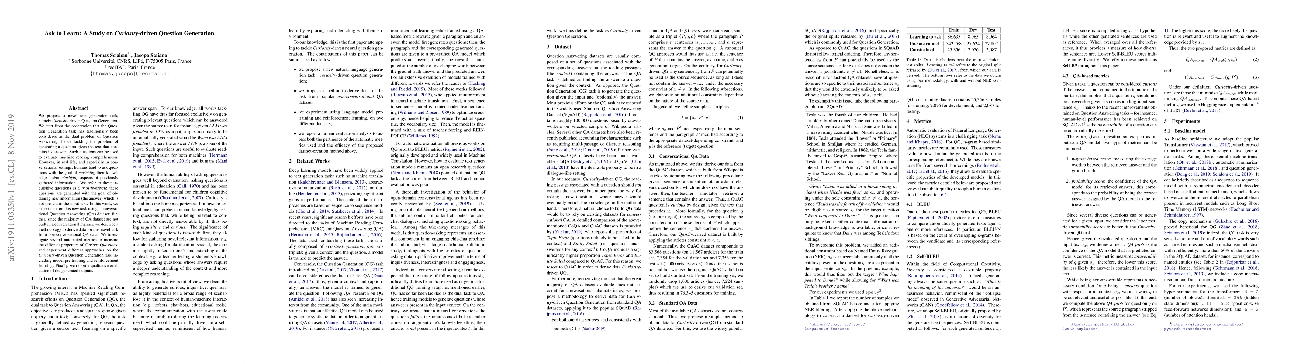 We propose a novel text generation task, namely Curiosity-driven Question Generation. We start from the observation that the Question Generation task has traditionally been considered as the dual problem of Question Answering, hence tackling the problem of generating a question given the text that contains its answer. Such questions can be used to evaluate machine reading comprehension. However, in real life, and especially in conversational settings, humans tend to ask questions with the goal of enriching their knowledge and/or clarifying aspects of previously gathered information. We refer to these inquisitive questions as Curiosity-driven: these questions are generated with the goal of obtaining new information (the answer) which is not present in the input text. In this work, we experiment on this new task using a conversational Question Answering (QA) dataset; further, since the majority of QA dataset are not built in a conversational manner, we describe a methodology to derive data for this novel task from non-conversational QA data. We investigate several automated metrics to measure the different properties of Curious Questions, and experiment different approaches on the Curiosity-driven Question Generation task, including model pre-training and reinforcement learning. Finally, we report a qualitative evaluation of the generated outputs.