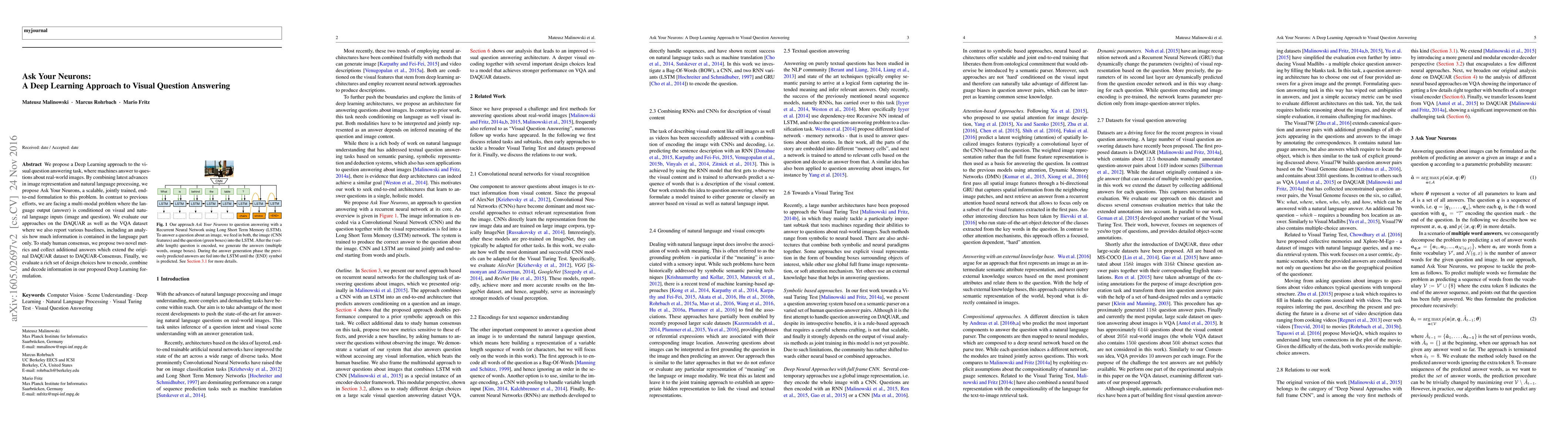 This paper proposes "Ask Your Neurons," a deep learning model for visual question answering that integrates advanced image representation and natural language processing techniques. The study introduces new metrics and extends the DAQUAR dataset to analyze human consensus, achieving strong performance while using a global image representation.