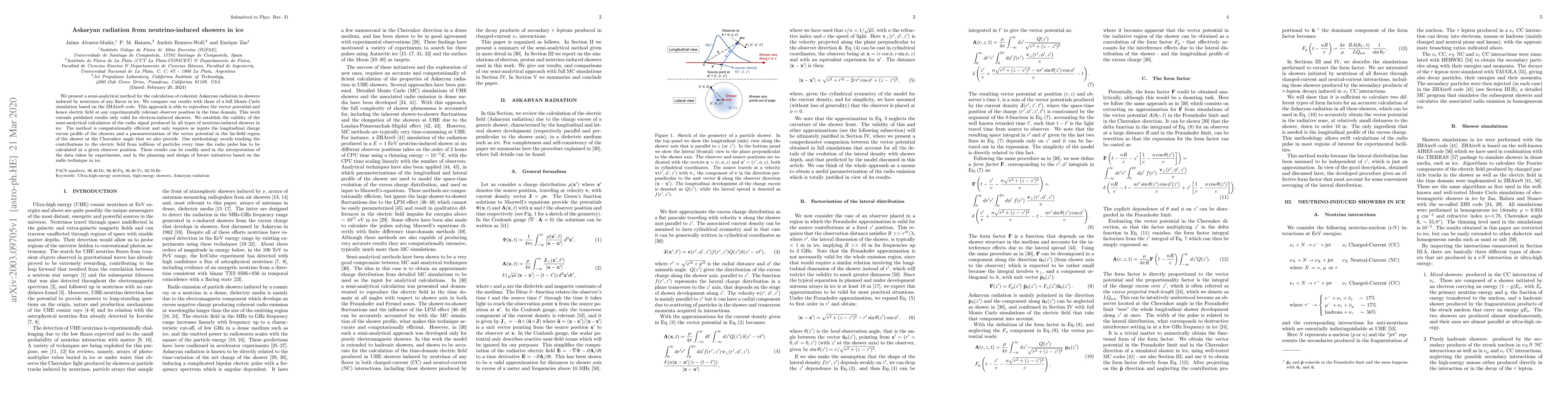 This paper introduces a semi-analytical method for calculating coherent Askaryan radiation from neutrino-induced showers in ice, comparing it with a full Monte Carlo simulation. The method efficiently reproduces the electric field and is applicable to all neutrino flavors, aiding in the interpretation of experimental data and future radio-based ice experiments.