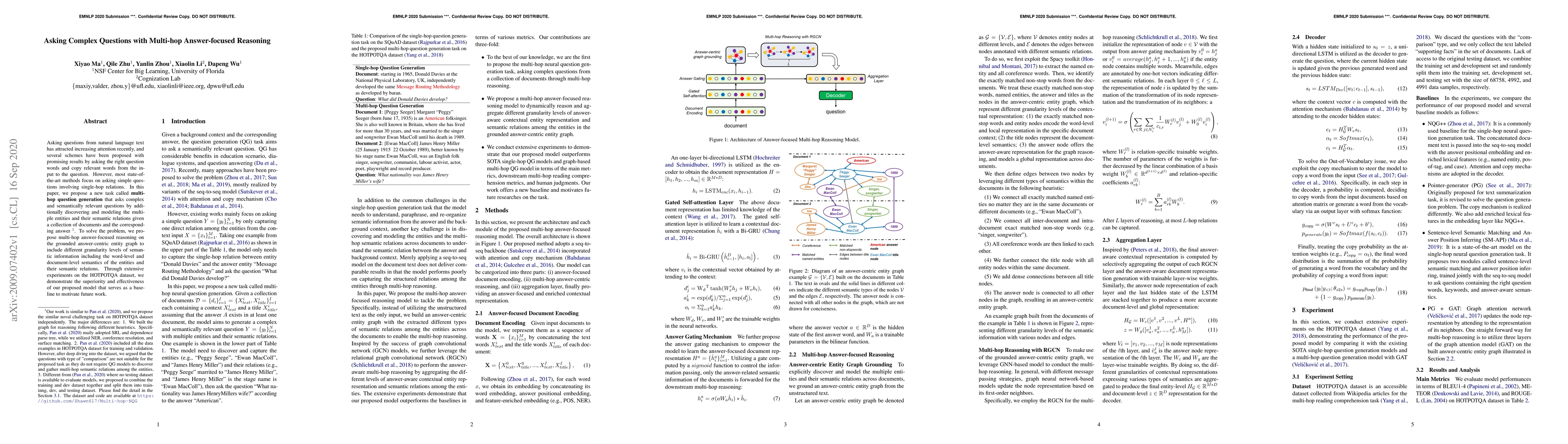 This paper introduces a new task of multihop question generation for complex questions involving multiple entities and their relations, proposing a multi-hop answer-focused reasoning model on an answer-centric entity graph. The model demonstrates superior performance on the HOTPOTQA dataset, establishing a baseline for future research.
