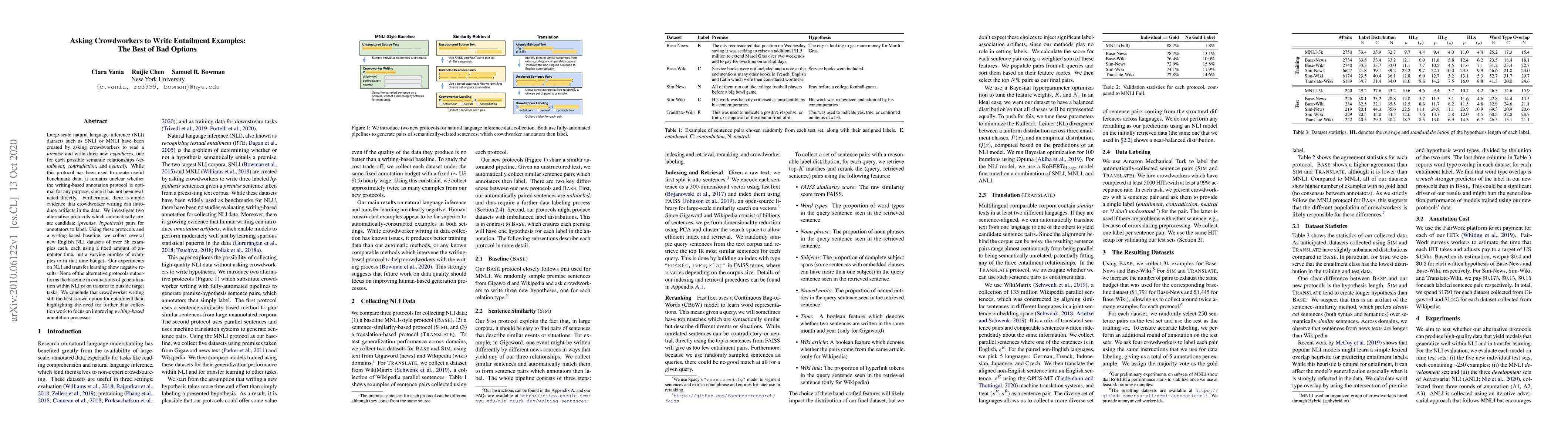This paper investigates alternative methods to crowdworker-written entailment examples in large-scale natural language inference datasets, finding that none outperform the baseline. Despite evidence of data artifacts from crowdworker writing, it remains the best known option for entailment data, emphasizing the need for improved writing-based annotation processes.