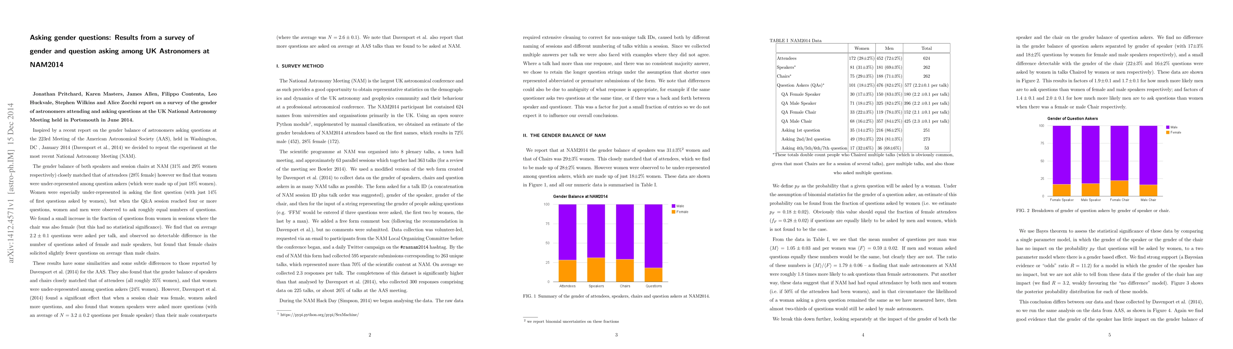 We report on a survey of astronomers asking questions at the most recent National Astronomy Meeting (NAM2014). The gender balance of both speakers and session chairs at NAM (31% and 29% women respectively) closely matched that of attendees (28% female). However, we find that women were under-represented among question askers (just 18% female). Women were especially under-represented in asking the first question (only 14% of first questions asked by women), but when the Q&A session reached four or more questions, women and men were observed to ask roughly equal numbers of questions. We found a small, but statistically insignificant, increase in the fraction of questions from women in sessions where the chair was also female. On average $2.2\pm0.1$ questions were asked per talk, with no detectable difference in the number of questions asked of female and male speakers, but on average female chairs solicited slightly fewer questions than male chairs. We compare these results to a similar study by Davenport et al. (2014) for the AAS, who also found under-representation of women amongst question askers, but saw more pronounced gender effects when a session chair or speaker were female. We conclude with suggestions for improving the balance of questions at future astronomy meetings.