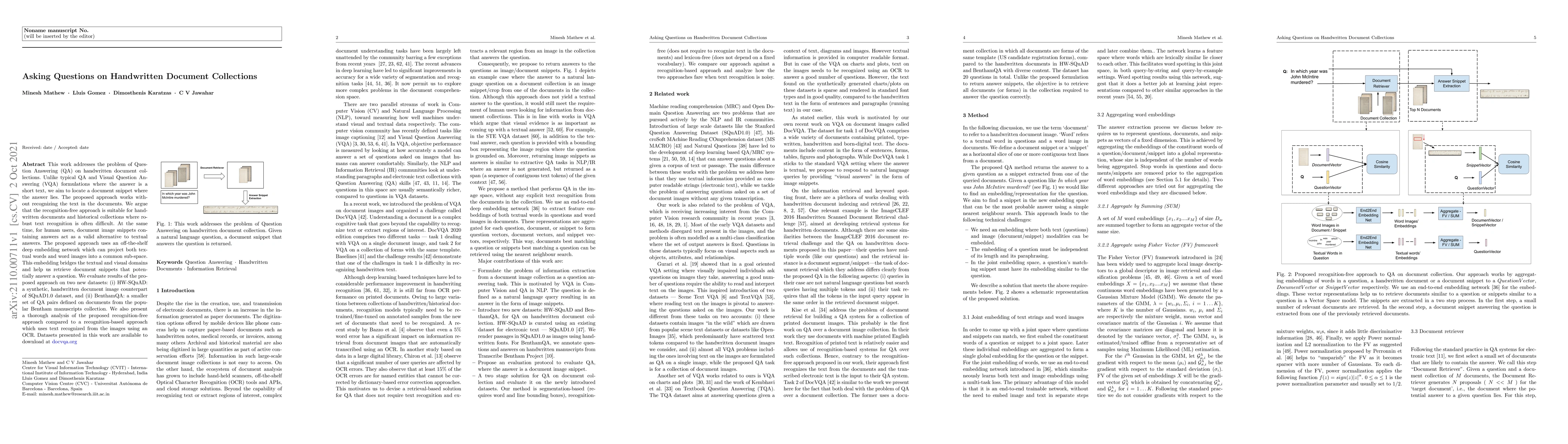 A recognition-free approach to Question Answering on handwritten document collections uses deep embedding networks to locate relevant snippet images, offering an alternative to traditional textual answers.