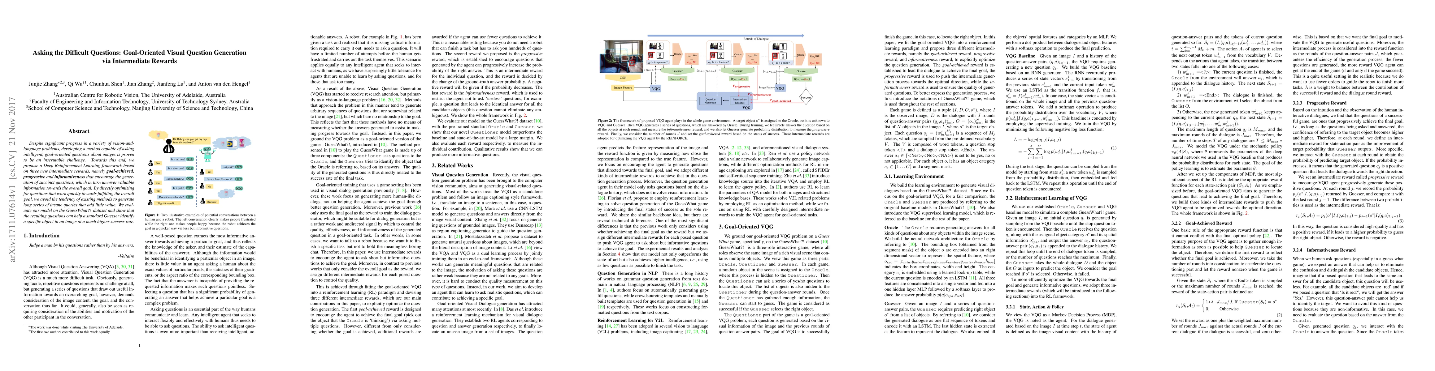 This paper proposes a Deep Reinforcement Learning framework that generates concise, goal-oriented questions about images, outperforming existing methods in identifying objects with high accuracy.
