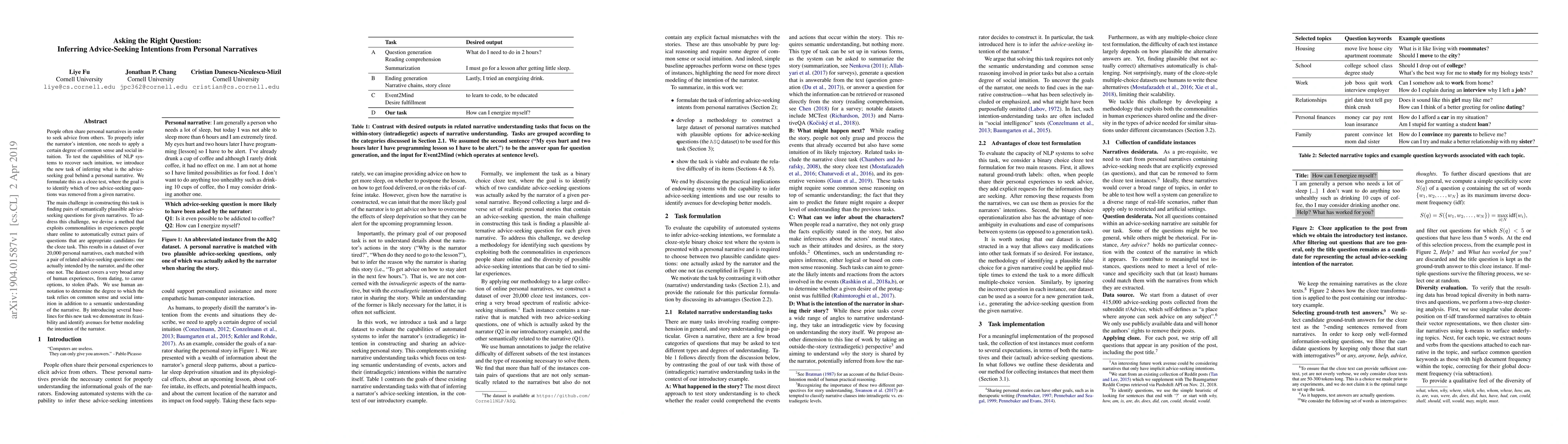 This paper introduces a new NLP task to infer the advice-seeking intentions behind personal narratives, formulated as a cloze test. The authors create a dataset of over 20,000 narratives paired with semantically plausible advice questions, leveraging commonalities in shared online experiences to generate suitable question pairs.