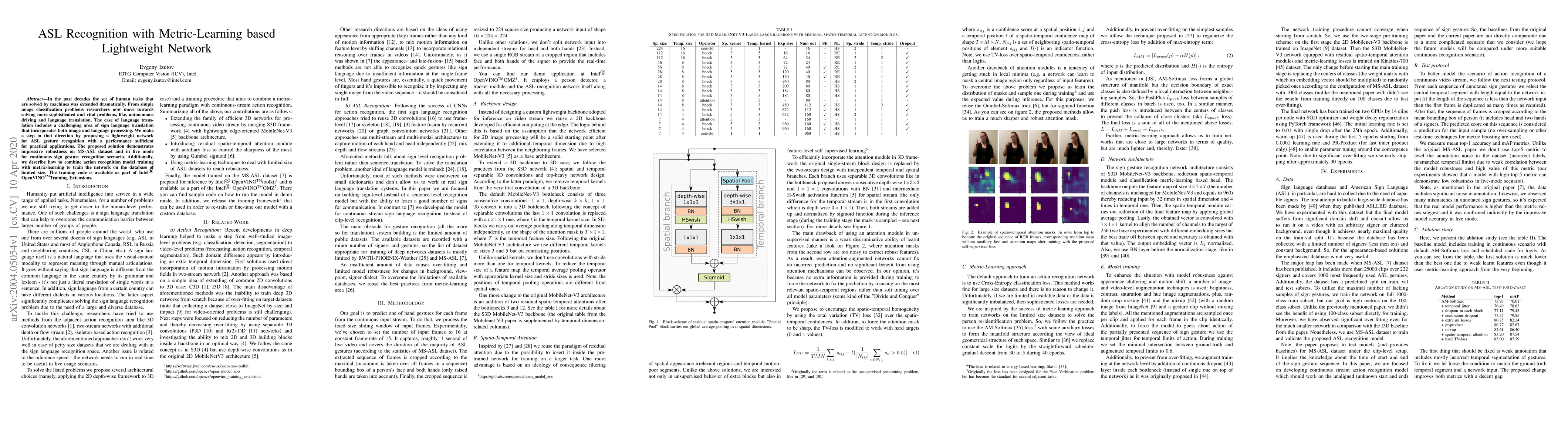 In the past decades the set of human tasks that are solved by machines was extended dramatically. From simple image classification problems researchers now move towards solving more sophisticated and vital problems, like, autonomous driving and language translation. The case of language translation includes a challenging area of sign language translation that incorporates both image and language processing. We make a step in that direction by proposing a lightweight network for ASL gesture recognition with a performance sufficient for practical applications. The proposed solution demonstrates impressive robustness on MS-ASL dataset and in live mode for continuous sign gesture recognition scenario. Additionally, we describe how to combine action recognition model training with metric-learning to train the network on the database of limited size. The training code is available as part of Intel OpenVINO Training Extensions.