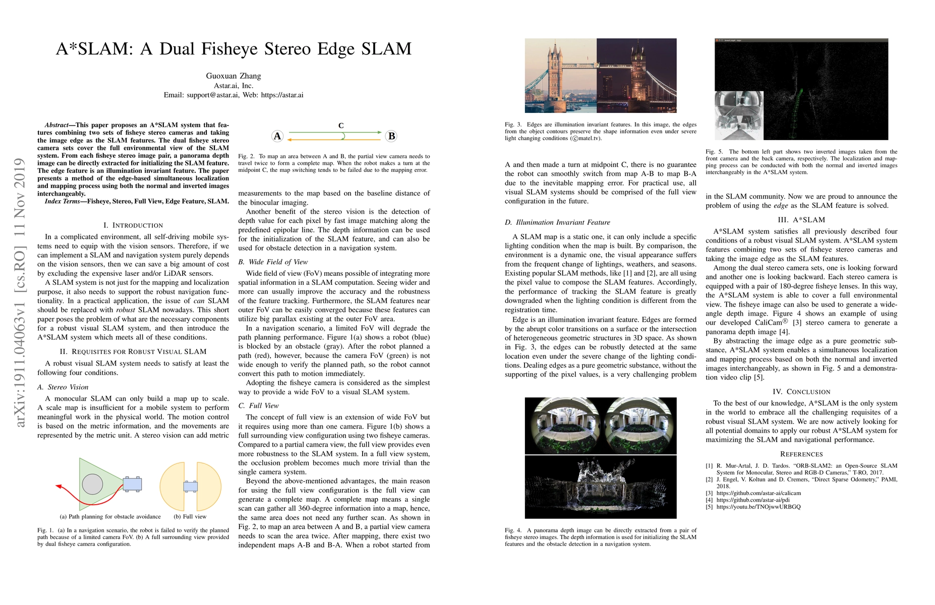 This paper proposes an A*SLAM system utilizing dual fisheye stereo cameras and edge features for simultaneous localization and mapping. The system extracts panorama depth images from fisheye stereo pairs and uses illumination-invariant edge features for robust SLAM.