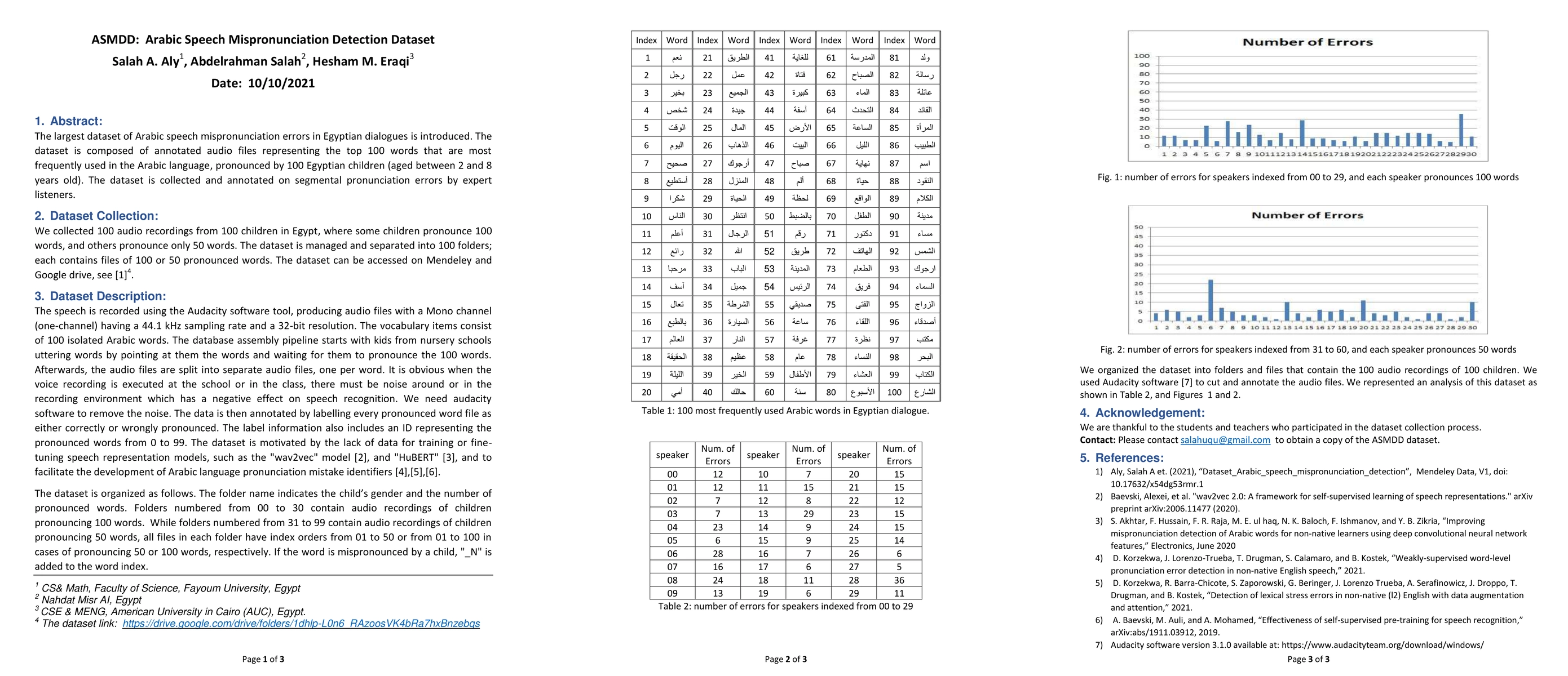 The largest dataset of Arabic speech mispronunciation detections in Egyptian dialogues is introduced. The dataset is composed of annotated audio files representing the top 100 words that are most frequently used in the Arabic language, pronounced by 100 Egyptian children (aged between 2 and 8 years old). The dataset is collected and annotated on segmental pronunciation error detections by expert listeners.