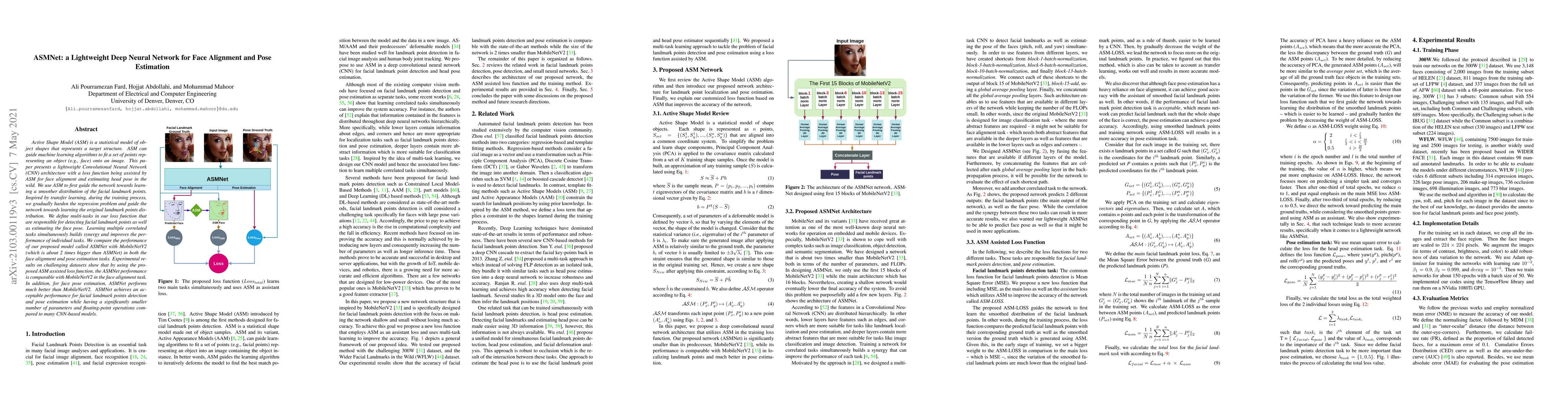 ASMNet is a lightweight CNN architecture that uses an Active Shape Model (ASM) assisted loss function to achieve accurate face alignment and pose estimation. Compared to MobileNetV2, ASMNet performs better in pose estimation and is comparable in face alignment, while being significantly more efficient in terms of parameters and computations.