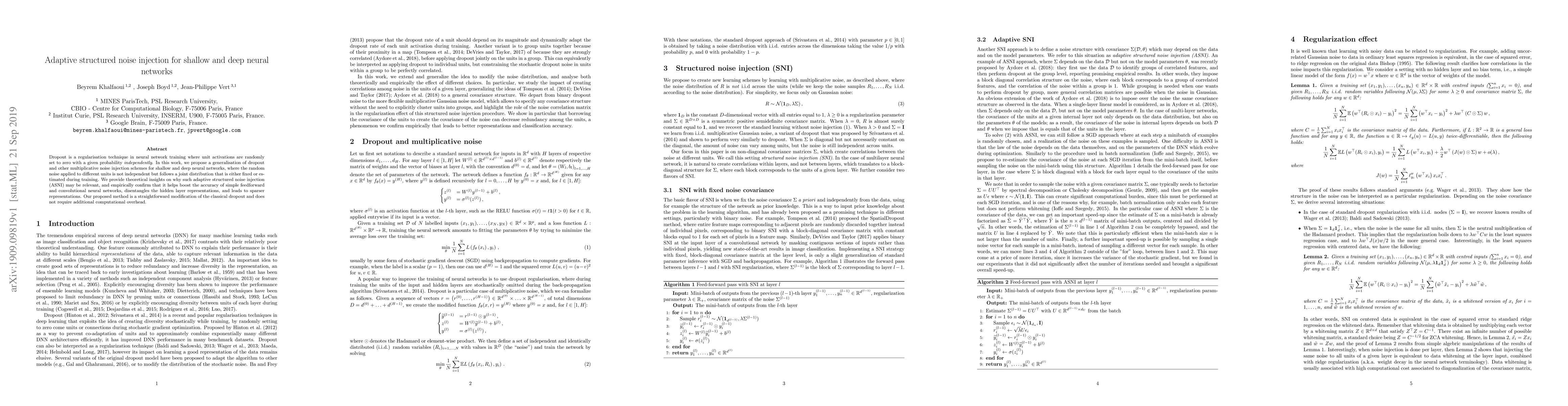 Dropout is a regularisation technique in neural network training where unit activations are randomly set to zero with a given probability \emph{independently}. In this work, we propose a generalisation of dropout and other multiplicative noise injection schemes for shallow and deep neural networks, where the random noise applied to different units is not independent but follows a joint distribution that is either fixed or estimated during training. We provide theoretical insights on why such adaptive structured noise injection (ASNI) may be relevant, and empirically confirm that it helps boost the accuracy of simple feedforward and convolutional neural networks, disentangles the hidden layer representations, and leads to sparser representations. Our proposed method is a straightforward modification of the classical dropout and does not require additional computational overhead.