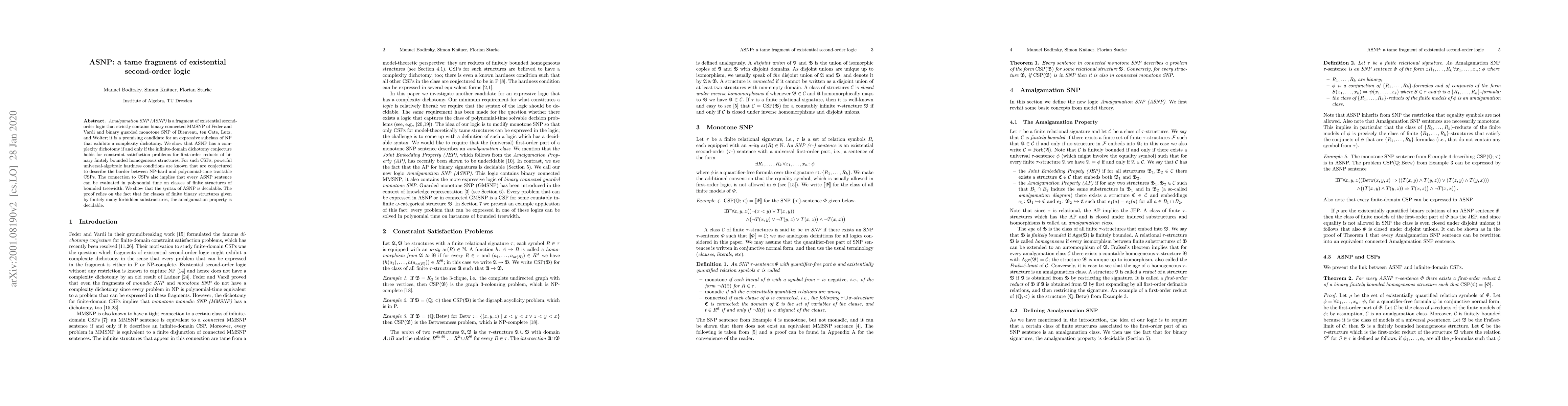 Amalgamation SNP (ASNP) is a fragment of existential second-order logic that strictly contains binary connected MMSNP of Feder and Vardi and binary guarded monotone SNP of Bienvenu, ten Cate, Lutz, and Wolter; it is a promising candidate for an expressive subclass of NP that exhibits a complexity dichotomy. We show that ASNP has a complexity dichotomy if and only if the infinite-domain dichotomy conjecture holds for constraint satisfaction problems for first-order reducts of binary finitely bounded homogeneous structures. For such CSPs, powerful universal-algebraic hardness conditions are known that are conjectured to describe the border between NP-hard and polynomial-time tractable CSPs. The connection to CSPs also implies that every ASNP sentence can be evaluated in polynomial time on classes of finite structures of bounded treewidth. We show that the syntax of ASNP is decidable. The proof relies on the fact that for classes of finite binary structures given by finitely many forbidden substructures, the amalgamation property is decidable.