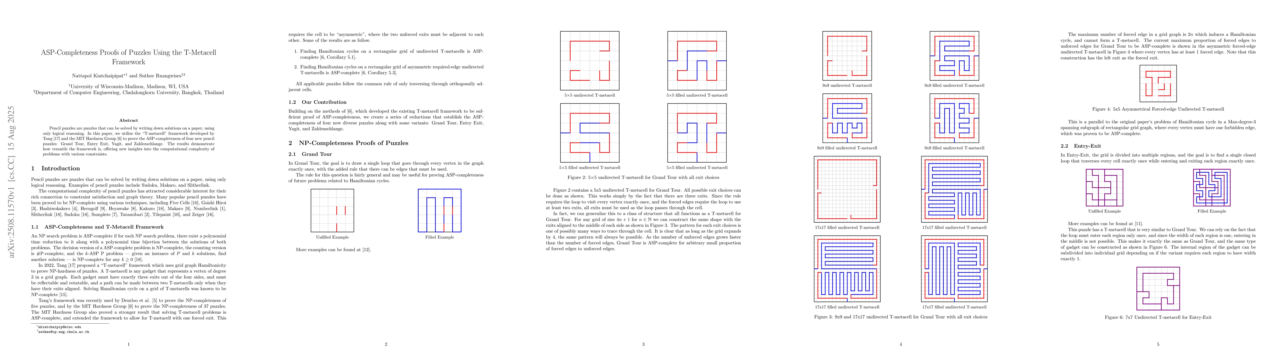 Pencil puzzles are puzzles that can be solved by writing down solutions on a paper, using only logical reasoning. In this paper, we utilize the "T-metacell" framework developed by Tang and the MIT Hardness Group to prove the ASP-completeness of four new pencil puzzles: Grand Tour, Entry Exit, Yagit, and Zahlenschlange. The results demonstrate how versatile the framework is, offering new insights into the computational complexity of problems with various constraints.