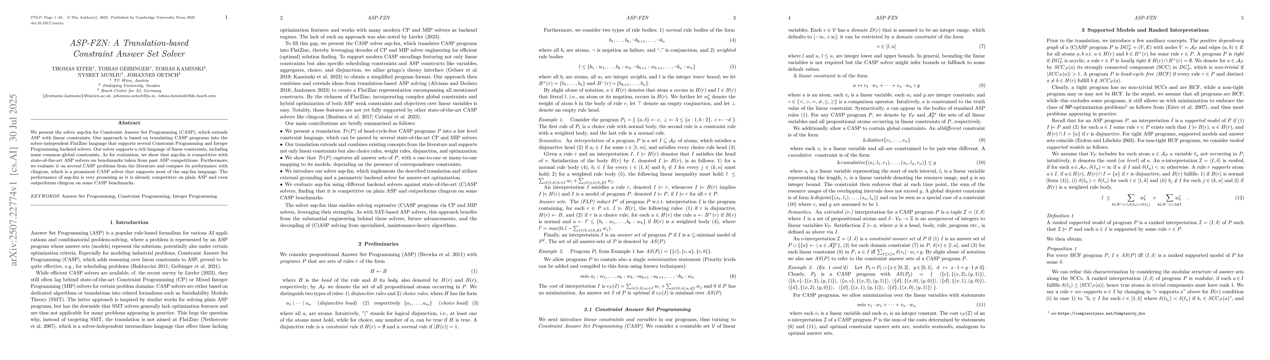 The research presents ASP-FZN, a translation-based Constraint Answer Set Solver (CASP) that extends ASP with linear constraints by translating CASP programs into FlatZinc, which interfaces with various backend solvers.