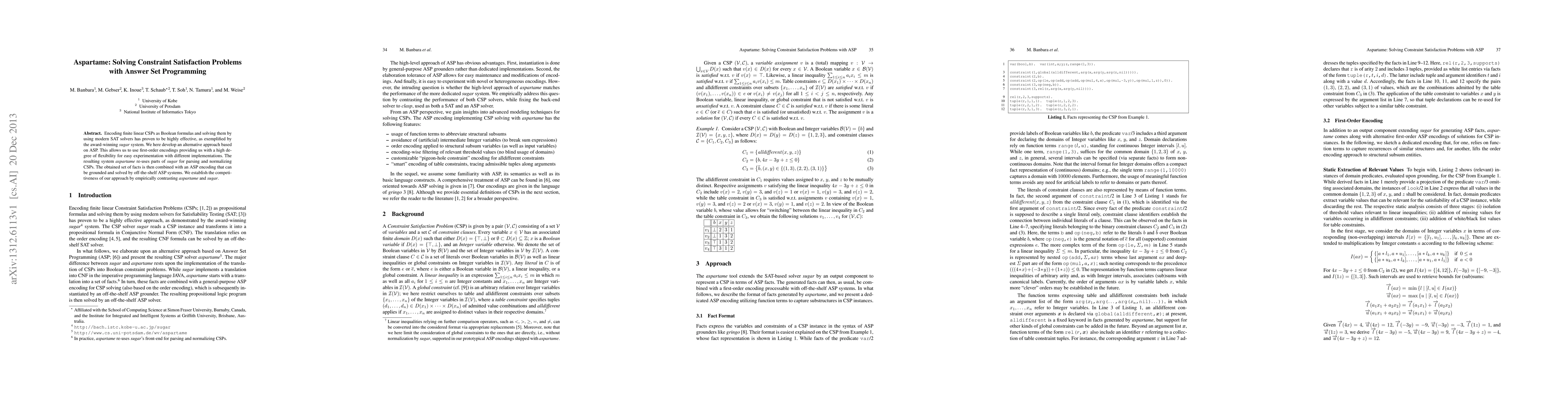 A new approach called Aspartame uses Answer Set Programming to solve Constraint Satisfaction Problems, offering flexibility and reusing parts of a successful existing system. This alternative method is compared to another approach, Sugar, showing its competitiveness through empirical testing.