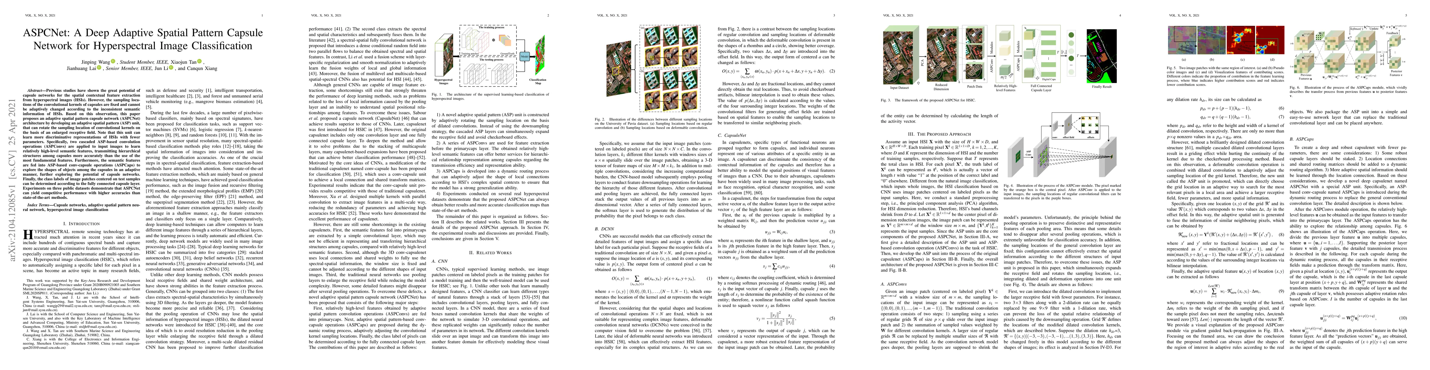ASPCNet introduces an adaptive spatial pattern unit to rotate convolutional kernel sampling locations, enhancing spatial feature extraction in hyperspectral image classification. The proposed architecture achieves higher classification accuracy by utilizing adaptive convolution and capsule operations to learn discriminative representations with fewer parameters.