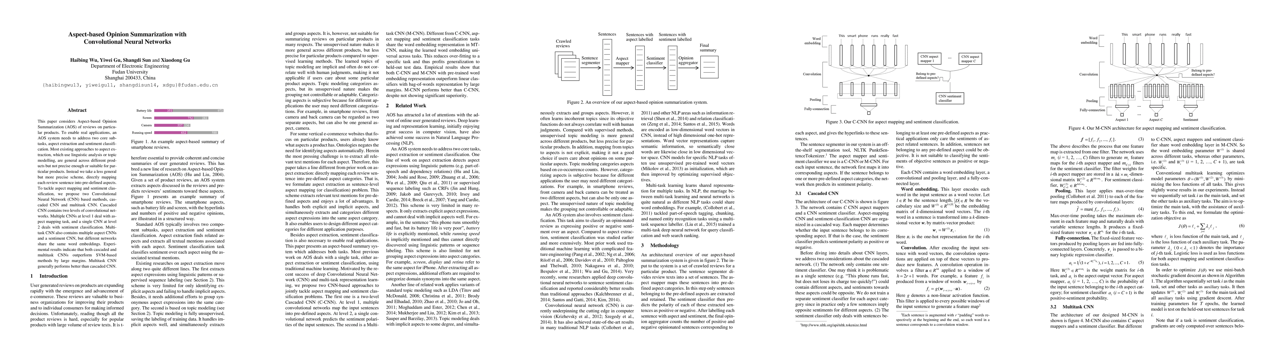 This paper proposes two Convolutional Neural Network (CNN) based methods for Aspect-based Opinion Summarization (AOS), using a cascaded CNN and a multitask CNN to improve aspect extraction and sentiment classification. Both methods outperform traditional SVM-based methods, with the multitask CNN generally achieving better results.
