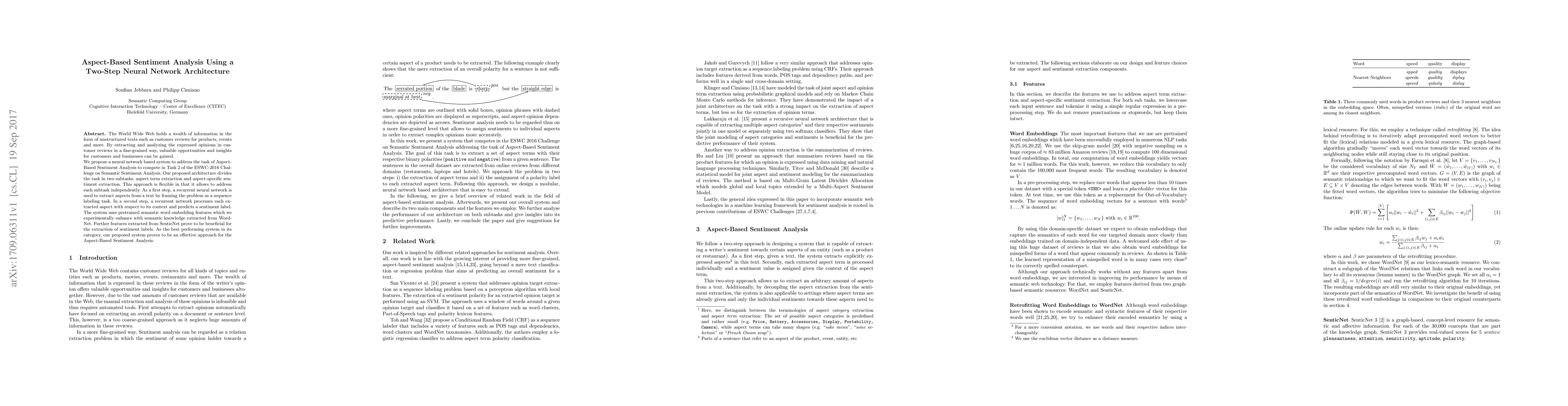The paper proposes a two-step neural network architecture for Aspect-Based Sentiment Analysis, employing a recurrent neural network for aspect term extraction followed by a recurrent network for sentiment prediction. The system uses enhanced pretrained semantic embeddings and features from WordNet and SenticNet, achieving top performance in the ESWC-2016 Challenge.
