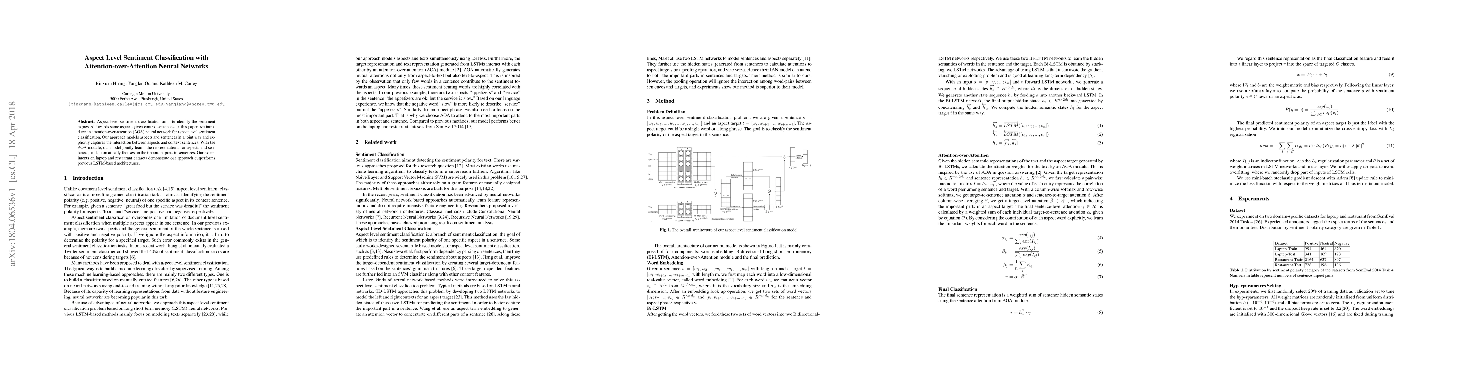 This paper introduces an attention-over-attention neural network for aspect-level sentiment classification, which jointly models aspects and sentences to capture interactions and outperforms previous LSTM-based models on laptop and restaurant datasets.