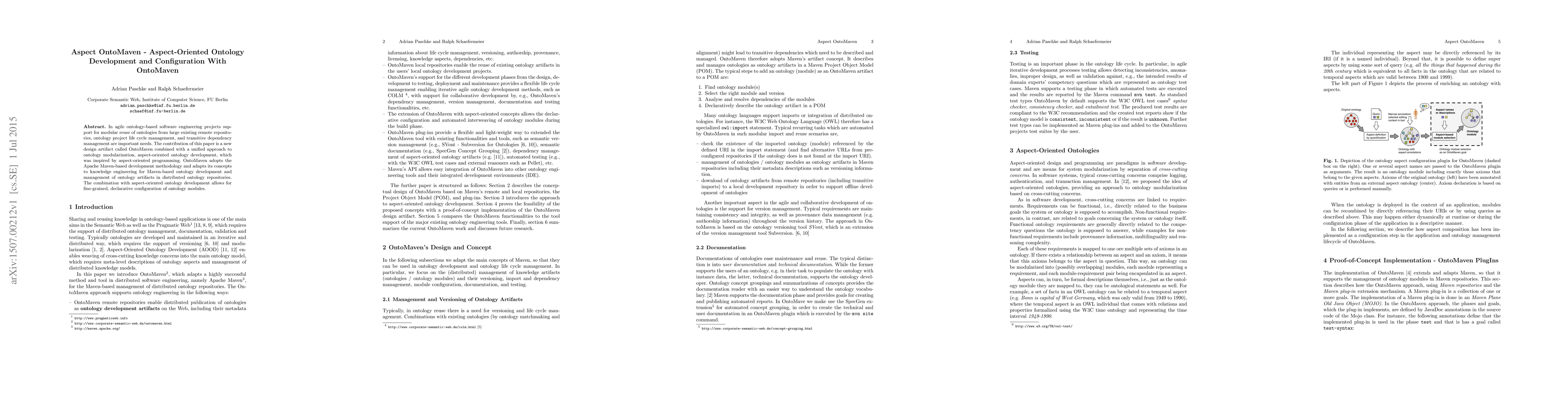 In agile ontology-based software engineering projects support for modular reuse of ontologies from large existing remote repositories, ontology project life cycle management, and transitive dependency management are important needs. The contribution of this paper is a new design artifact called OntoMaven combined with a unified approach to ontology modularization, aspect-oriented ontology development, which was inspired by aspect-oriented programming. OntoMaven adopts the Apache Maven-based development methodology and adapts its concepts to knowledge engineering for Maven-based ontology development and management of ontology artifacts in distributed ontology repositories. The combination with aspect-oriented ontology development allows for fine-grained, declarative configuration of ontology modules.