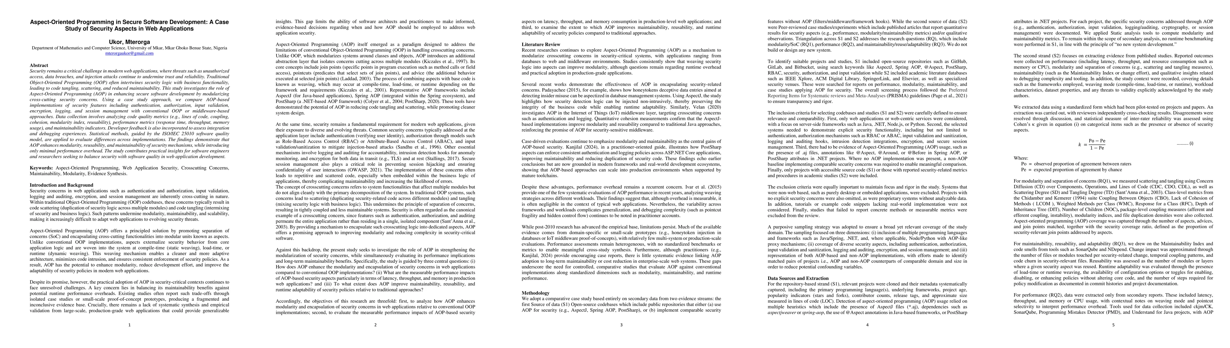 Security remains a critical challenge in modern web applications, where threats such as unauthorized access, data breaches, and injection attacks continue to undermine trust and reliability. Traditional Object-Oriented Programming (OOP) often intertwines security logic with business functionality, leading to code tangling, scattering, and reduced maintainability. This study investigates the role of Aspect-Oriented Programming (AOP) in enhancing secure software development by modularizing cross-cutting security concerns. Using a case study approach, we compare AOP-based implementations of security features including authentication, authorization, input validation, encryption, logging, and session management with conventional OOP or middleware-based approaches. Data collection involves analyzing code quality metrics (e.g., lines of code, coupling, cohesion, modularity index, reusability), performance metrics (response time, throughput, memory usage), and maintainability indicators. Developer feedback is also incorporated to assess integration and debugging experiences. Statistical methods, guided by the ISO/IEC 25010 software quality model, are applied to evaluate differences across implementations. The findings demonstrate that AOP enhances modularity, reusability, and maintainability of security mechanisms, while introducing only minimal performance overhead. The study contributes practical insights for software engineers and researchers seeking to balance security with software quality in web application development.