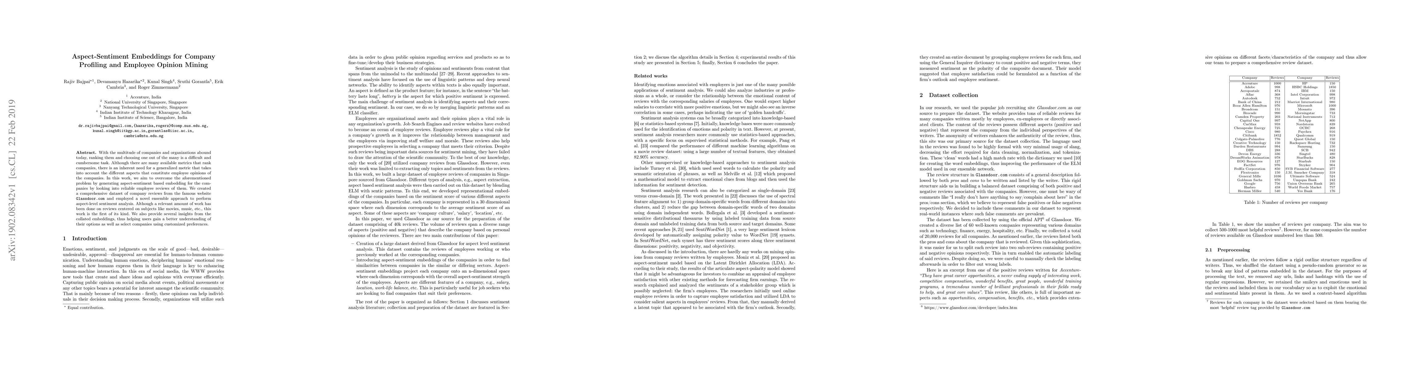 With the multitude of companies and organizations abound today, ranking them and choosing one out of the many is a difficult and cumbersome task. Although there are many available metrics that rank companies, there is an inherent need for a generalized metric that takes into account the different aspects that constitute employee opinions of the companies. In this work, we aim to overcome the aforementioned problem by generating aspect-sentiment based embedding for the companies by looking into reliable employee reviews of them. We created a comprehensive dataset of company reviews from the famous website Glassdoor.com and employed a novel ensemble approach to perform aspect-level sentiment analysis. Although a relevant amount of work has been done on reviews centered on subjects like movies, music, etc., this work is the first of its kind. We also provide several insights from the collated embeddings, thus helping users gain a better understanding of their options as well as select companies using customized preferences.