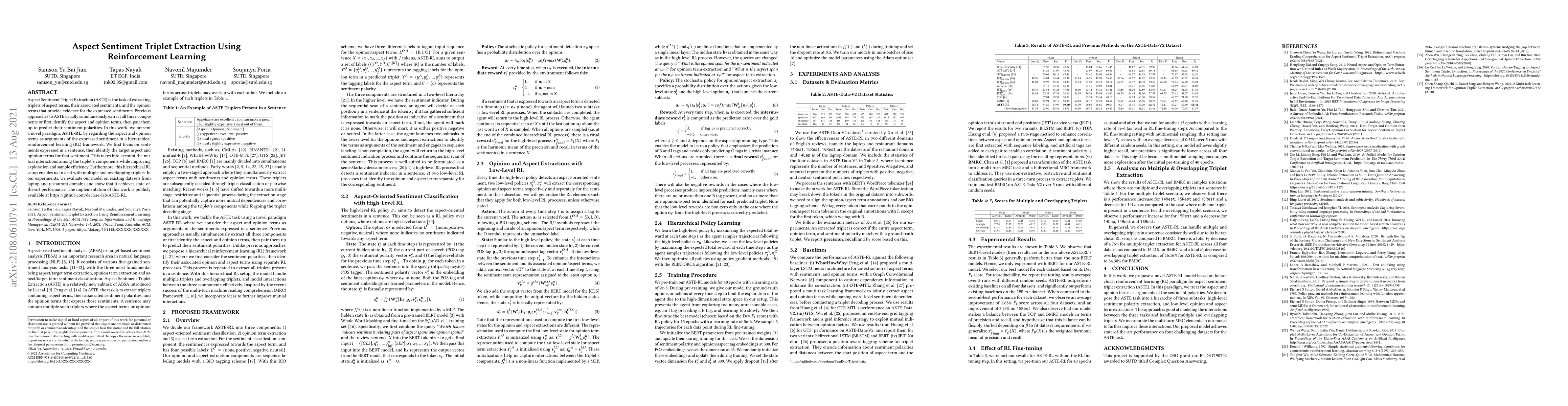 This paper introduces ASTE-RL, a novel reinforcement learning framework for extracting aspect sentiment triplets, which considers aspect and opinion terms in a hierarchical manner to improve efficiency and performance. Experimental results show state-of-the-art performance on laptop and restaurant datasets.