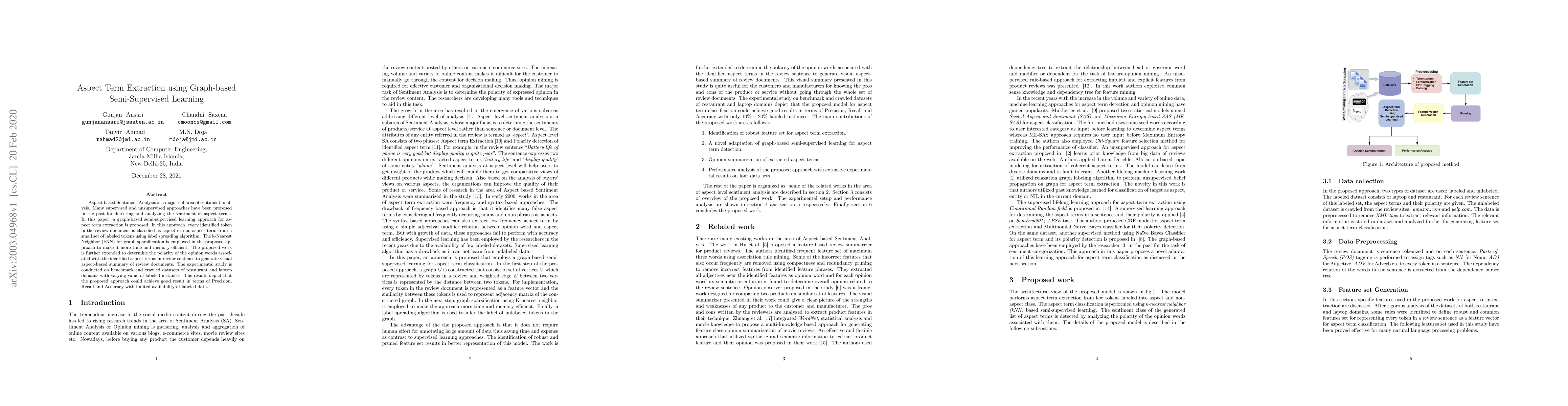 This paper proposes a graph-based semi-supervised learning method for aspect term extraction in sentiment analysis, using label spreading and kNN for efficiency. Experiments on restaurant and laptop datasets show it achieves high Precision, Recall, and Accuracy with limited labeled data.