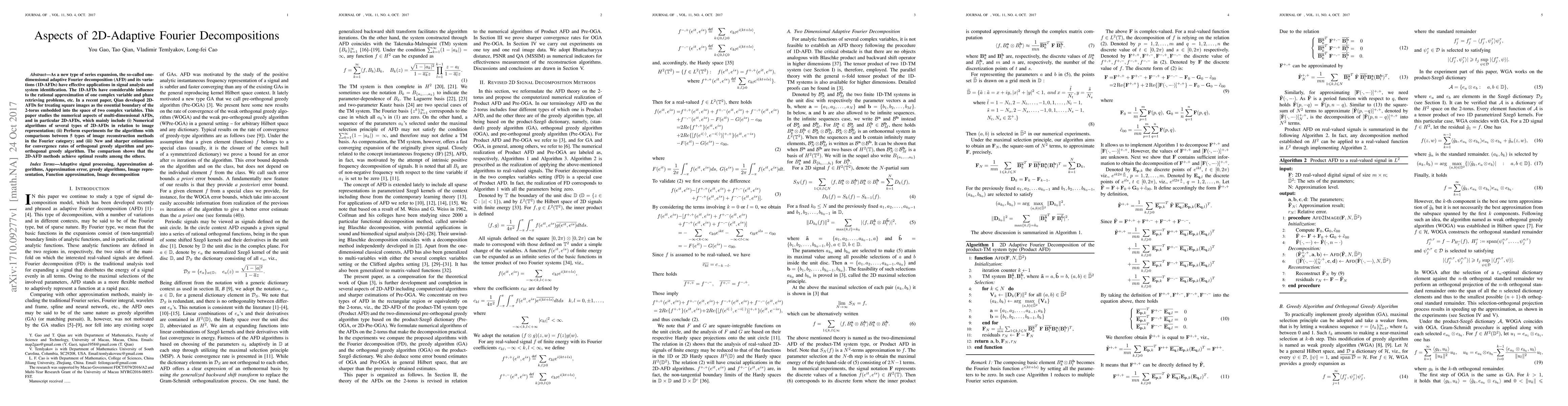 As a new type of series expansion, the so-called one-dimensional adaptive Fourier decomposition (AFD) and its variations (1D-AFDs) have effective applications in signal analysis and system identification. The 1D-AFDs have considerable influence to the rational approximation of one complex variable and phase retrieving problems, etc. In a recent paper, Qian developed 2D-AFDs for treating square images as the essential boundary of the 2-torus embedded into the space of two complex variables. This paper studies the numerical aspects of multi-dimensional AFDs, and in particular 2D-AFDs, which mainly include (i) Numerical algorithms of several types of 2D-AFDs in relation to image representation; (ii) Perform experiments for the algorithms with comparisons between 5 types of image reconstruction methods in the Fourier category; and (iii) New and sharper estimations for convergence rates of orthogonal greedy algorithm and pre-orthogonal greedy algorithm. The comparison shows that the 2D-AFD methods achieve optimal results among the others.