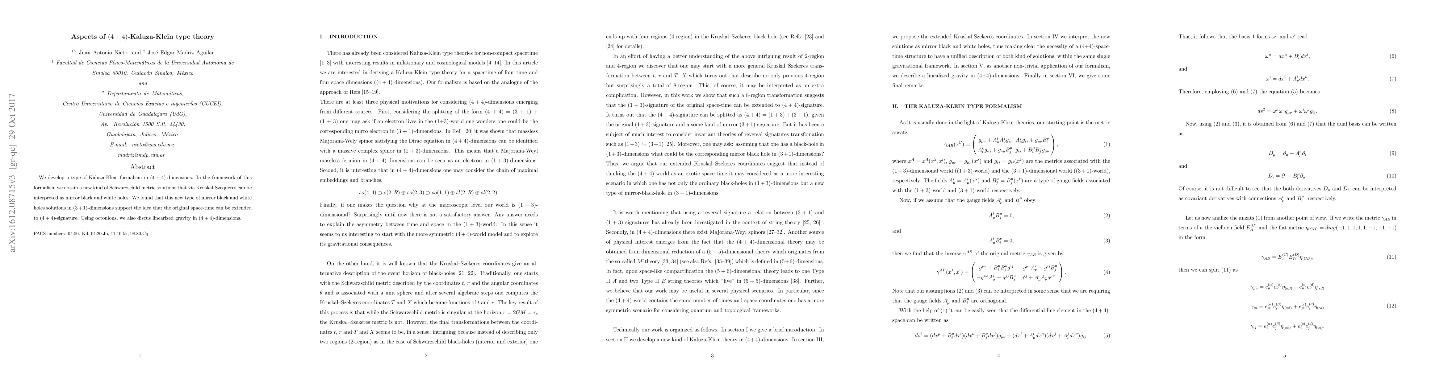 We develop a type of Kaluza-Klein formalism in $(4+4)$-dimensions. In the framework of this formalism we obtain a new kind of Schwarzschild metric solutions that via Kruskal-Szequeres can be interpreted as mirror black and white holes. We found that this new type of mirror black and white holes solutions in $(3+1)$-dimensions support the idea that the original space-time can be extended to $(4+4)$-signature. Using octonions, we also discus linearized gravity in $(4+4)$-dimensions.