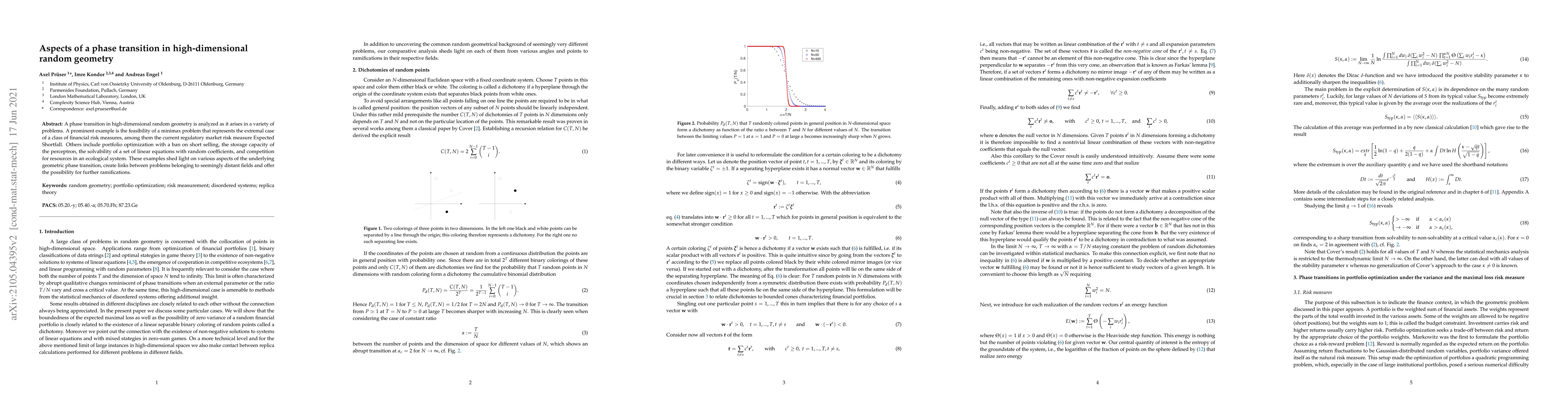 This paper investigates the phase transition in high-dimensional random geometry, exemplified by the feasibility of a minimax problem in financial risk measures like Expected Shortfall. It also connects this transition to portfolio optimization, perceptron storage, linear equation solvability, and ecological resource competition, highlighting interdisciplinary links and potential future research directions.