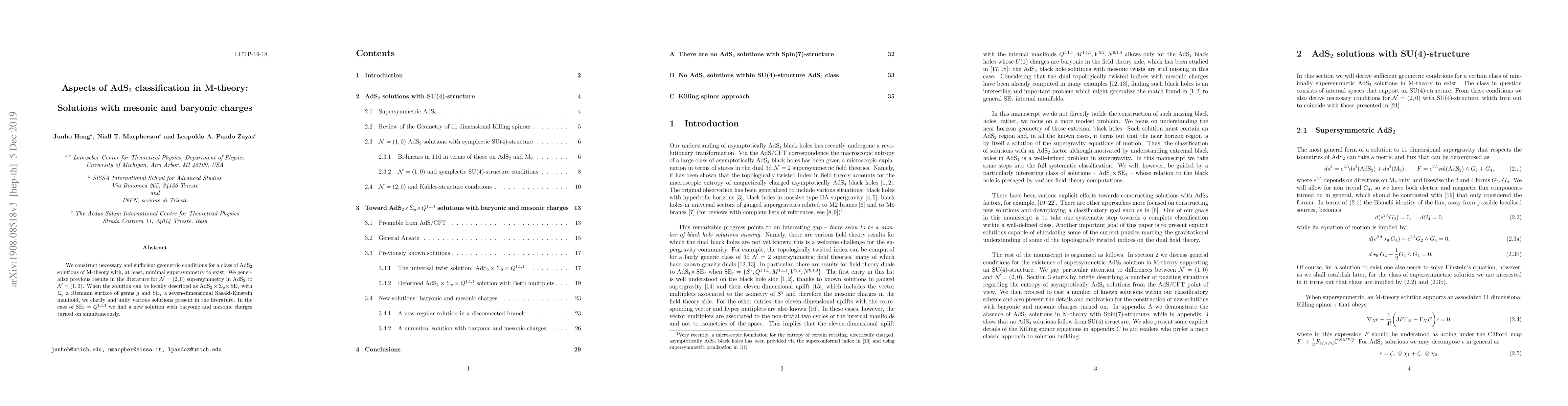 We construct necessary and sufficient geometric conditions for a class of AdS$_2$ solutions of M-theory with, at least, minimal supersymmetry to exist. We generalize previous results in the literature for ${\cal N}=(2,0)$ supersymmetry in AdS$_2$ to ${\cal N}=(1,0)$. When the solution can be locally described as AdS$_2\times \Sigma_g \times \,$SE$_7$ with $\Sigma_g$ a Riemann surface of genus $g$ and SE$_7$ a seven-dimensional Sasaki-Einstein manifold, we clarify and unify various solutions present in the literature. In the case of SE$_7=Q^{1,1,1}$ we find a new solution with baryonic and mesonic charges turned on simultaneously.