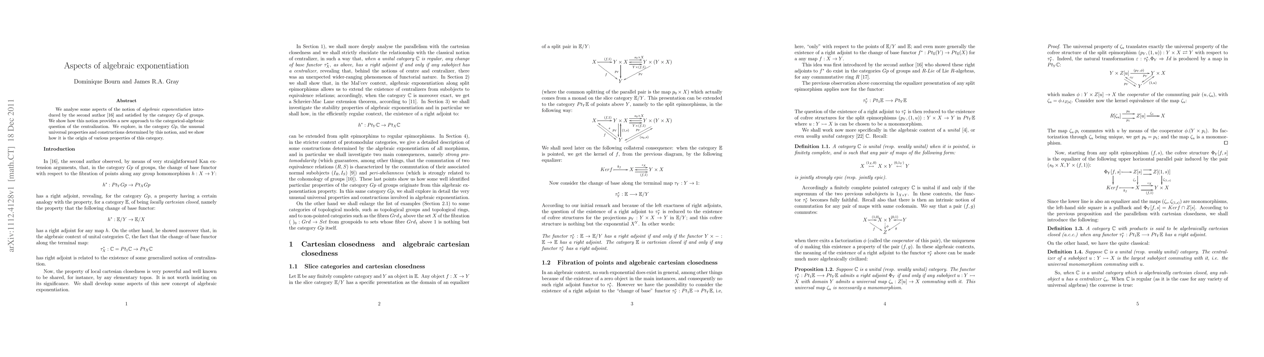 We analyse some aspects of the notion of algebraic exponentiation introduced by the second author [16] and satisfied by the category of groups. We show how this notion provides a new approach to the categorical-algebraic question of the centralization. We explore, in the category of groups, the unusual universal properties and constructions determined by this notion, and we show how it is the origin of various properties of this category.