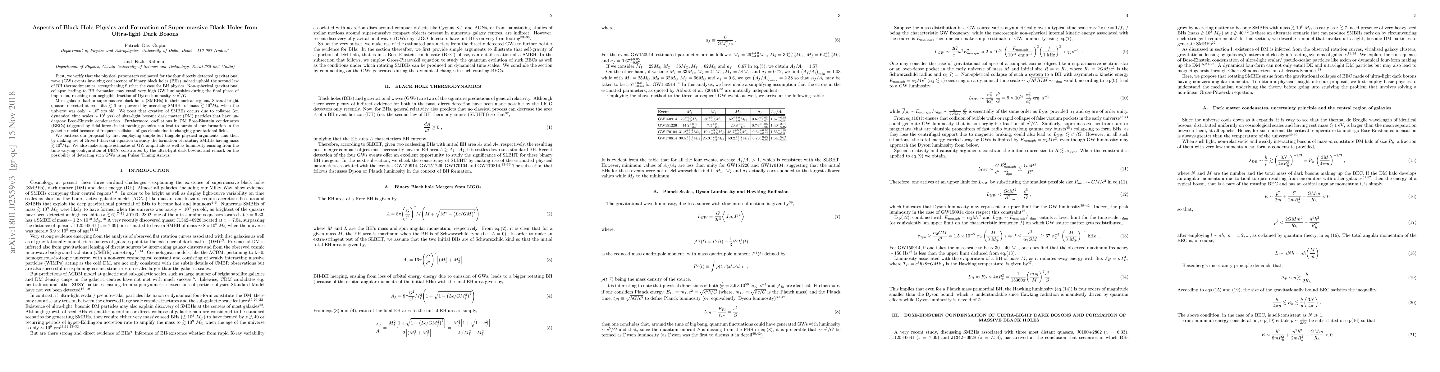 First, we verify that the physical parameters estimated for the four directly detected gravitational wave (GW) events involving coalescence of binary black holes (BHs) indeed uphold the second law of BH thermodynamics, strengthening further the case for BH physics. Non-spherical gravitational collapse leading to BH formation may entail very high GW luminosities during the final phase of implosion, reaching non-negligible fraction of Dyson luminosity $\sim c^5/G $. Most galaxies harbor supermassive black holes (SMBHs) in their nuclear regions. Several bright quasars detected at redshifts $\gtrsim$ 6 are powered by accreting SMBHs of mass $\gtrsim 10^9 M_\odot$ when the universe was only $\sim 10^9$ yrs old. We posit that creation of SMBHs occurs due to collapse (on dynamical time scales $\sim 10^8$ yrs) of ultra-light bosonic dark matter (DM) particles that have undergone Bose-Einstein condensation. Furthermore, oscillations in DM Bose-Einstein condensates (BECs) triggered by tidal forces in interacting galaxies can lead to bursts of star formation in the galactic nuclei because of frequent collisions of gas clouds due to changing gravitational field. We buttress our proposal by first employing simple but tangible physical arguments, and then by making use of Gross-Pitaevskii equation to study the formation of rotating SMBHs having mass $\gtrsim 10^9 M_\odot$. We also make simple estimates of GW amplitude as well as luminosity ensuing from the time varying configuration of BECs, constituted by the ultra-light dark bosons, and remark on the possibility of detecting such GWs using Pulsar Timing Arrays.