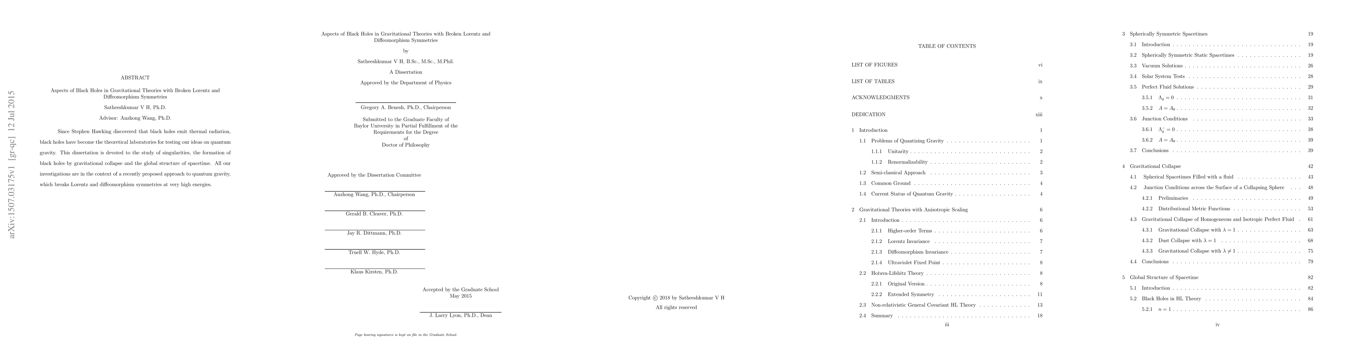 Since Stephen Hawking discovered that black holes emit thermal radiation, black holes have become the theoretical laboratories for testing our ideas on quantum gravity. This dissertation is devoted to the study of singularities, the formation of black holes by gravitational collapse and the global structure of spacetime. All our investigations are in the context of a recently proposed approach to quantum gravity, which breaks Lorentz and diffeomorphism symmetries at very high energies.