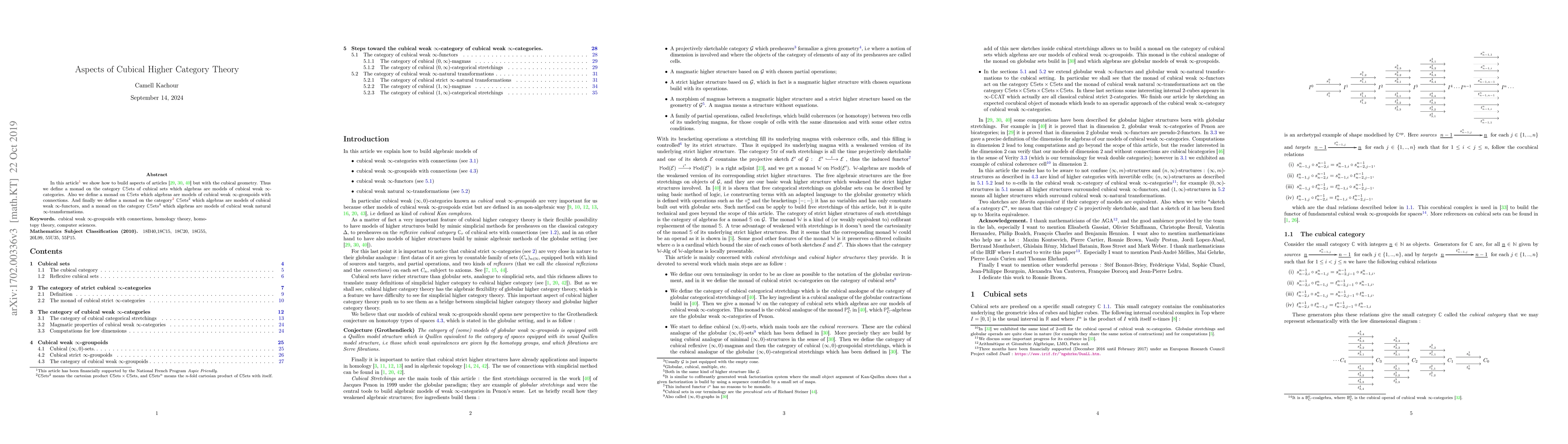 In this article we show how to build main aspects of our paper on globular weak $(\infty,n)$-categories, but now for the cubical geometry. Thus we define a monad on the category $\mathbb{C}\mathbb{S}ets$ of cubical sets which algebras are models of cubical weak $\infty$-categories. Also for each $n\in\mathbb{N}$ we define a monad on $\mathbb{C}\mathbb{S}ets$ which algebras are models of cubical weak $(\infty,n)$-categories. And finally we define a monad on the category $\mathbb{C}\mathbb{S}ets^2$ which algebras are models of cubical weak $\infty$-functors, and a monad on the category $\mathbb{C}\mathbb{S}ets^4$ which algebras are models of cubical weak natural $\infty$-transformations.