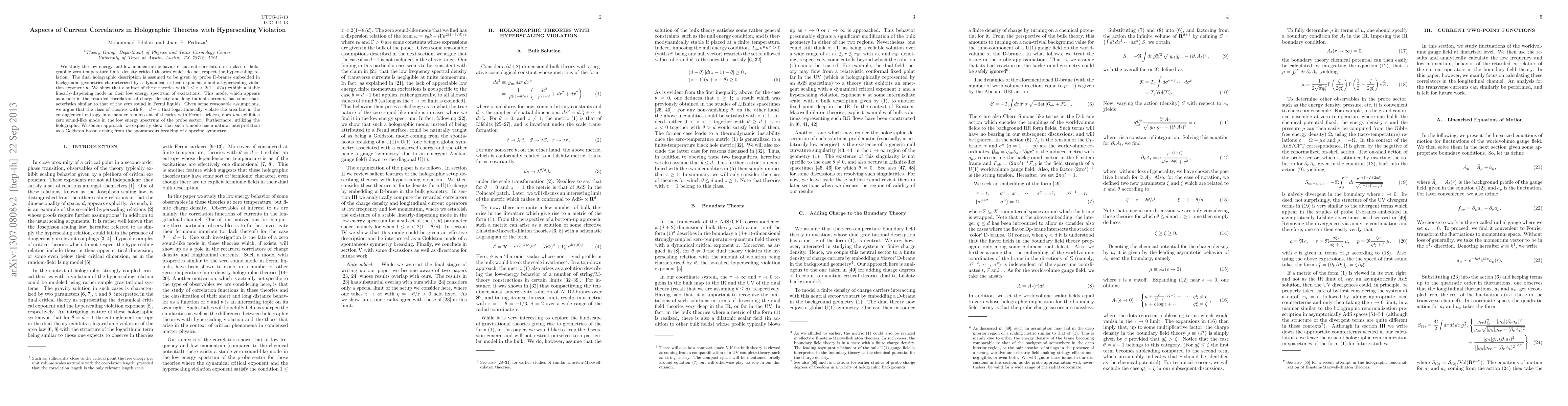 This paper investigates current correlators in holographic zero-temperature finite density critical theories with hyperscaling violation, revealing a stable linearly-dispersing mode in the low energy spectrum akin to zero sound in Fermi liquids. The study also shows that theories with $\theta = d-1$ do not exhibit this mode, interpreted as a Goldstone boson from symmetry breaking.