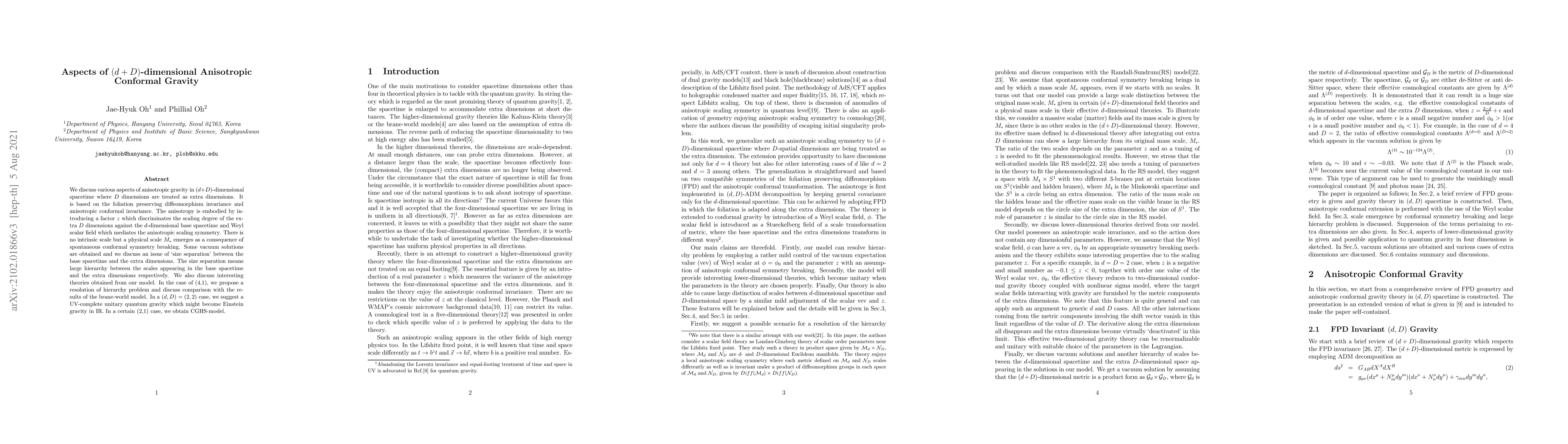 This paper explores anisotropic conformal gravity in $(d+D)$-dimensional spacetime with $D$ extra dimensions, introducing a scaling factor $z$ to differentiate the scaling of the extra dimensions. It discusses spontaneous conformal symmetry breaking and the emergence of a physical scale $M_*$, proposing resolutions for the hierarchy problem and suggesting UV-complete quantum gravity models.