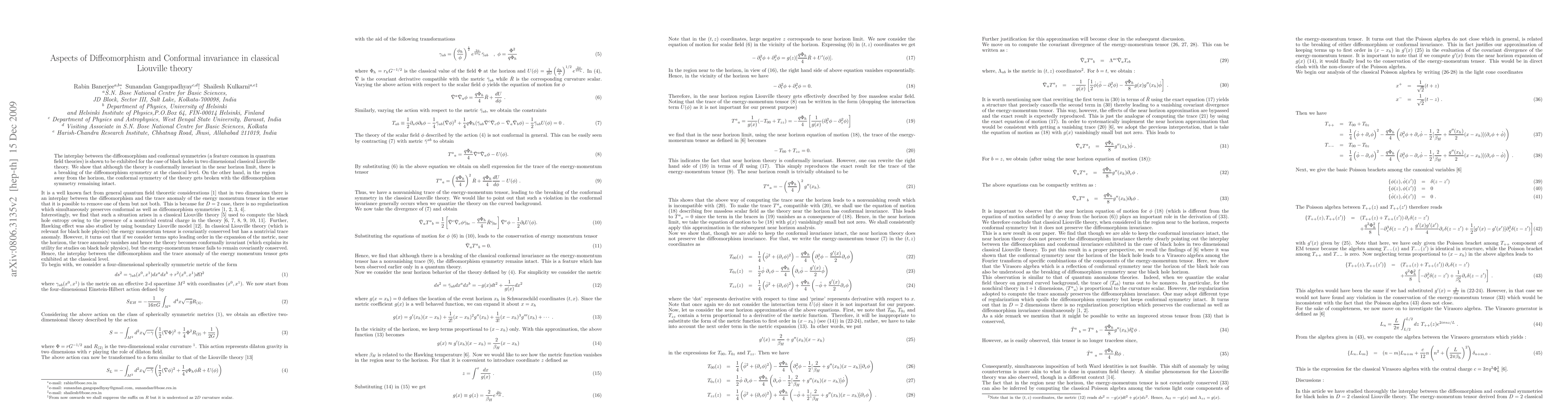 The interplay between the diffeomorphism and conformal symmetries (a feature common in quantum field theories) is shown to be exhibited for the case of black holes in two dimensional classical Liouville theory. We show that although the theory is conformally invariant in the near horizon limit, there is a breaking of the diffeomorphism symmetry at the classical level. On the other hand, in the region away from the horizon, the conformal symmetry of the theory gets broken with the diffeomorphism symmetry remaining intact.