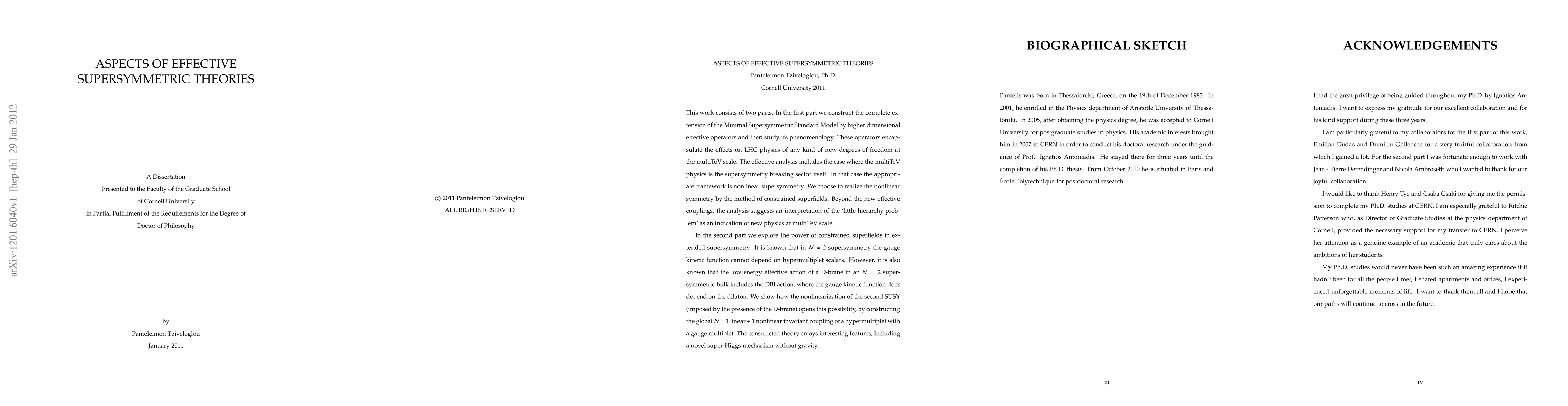 This work consists of two parts. In the first part we construct the complete extension of the Minimal Supersymmetric Standard Model by higher dimensional effective operators and study its phenomenology. These operators encapsulate the effects on LHC physics of possible new degrees of freedom at the multiTeV scale. The effective analysis includes the case where the multiTeV physics is the supersymmetry breaking sector itself. Beyond the new effective couplings, the analysis suggests an interpretation of the 'little hierarchy problem' as an indication of new physics at multiTeV scale. In the second part we explore the power of constrained superfields in extended supersymmetry. It is known that in N = 2 supersymmetry the gauge kinetic function cannot depend on hypermultiplet scalars. However, it is also known that the low energy effective action of a D-brane in an N = 2 supersymmetric bulk includes the DBI action, where the gauge kinetic function does depend on the dilaton. We show how the nonlinearization of the second SUSY (imposed by the presence of the D-brane) opens this possibility, by constructing the global N = 1 linear + 1 nonlinear invariant coupling of a hypermultiplet with a gauge multiplet. The constructed theory enjoys interesting features, including a novel super-Higgs mechanism without gravity.