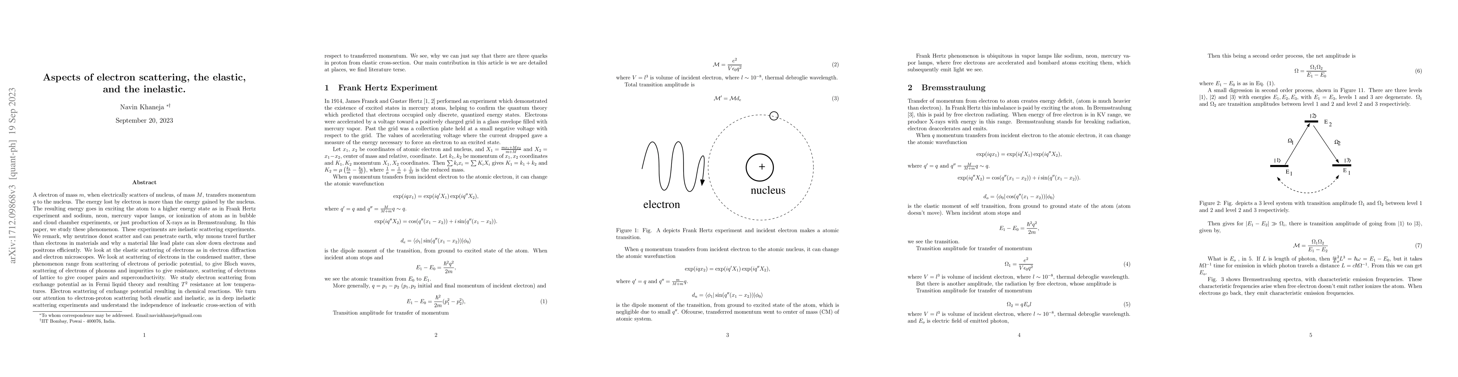A electron of mass $m$, when electrically scatters of nucleus, of mass $M$, transfers momentum $q$ to the nucleus. The energy lost by electron is more than the energy gained by the nucleus. The resulting energy goes in exciting the atom to a higher energy state as in Frank Hertz experiment and sodium, neon, mercury vapor lamps, or ionization of atom as in bubble and cloud chamber experiments, or just production of X-rays as in Bremsstraulung. In this paper, we study these phenomenon. These experiments are inelastic scattering experiments. We remark, why neutrinos donot scatter and can penetrate earth, why muons travel further than electrons in materials and why a material like lead plate can slow down electrons and positrons efficiently. We look at the elastic scattering of electrons as in electron diffraction and electron microscopes. We look at scattering of electrons in the condensed matter, these phenomenon range from scattering of electrons of periodic potential, to give Bloch waves, scattering of electrons of phonons and impurities to give resistance, scattering of electrons of lattice to give cooper pairs and superconductivity. We study electron scattering from exchange potential as in Fermi liquid theory and resulting $T^2$ resistance at low temperatures. Electron scattering of exchange potential resulting in chemical reactions. We turn our attention to electron-proton scattering both eleastic and inelastic, as in deep inelastic scattering experiments and understand the independence of ineleastic cross-section of with respect to transferred momentum. We see, why we can just say that there are three quarks in proton from elastic cross-section. Our main contribution in this article is we are detailed at places, we find literature terse.