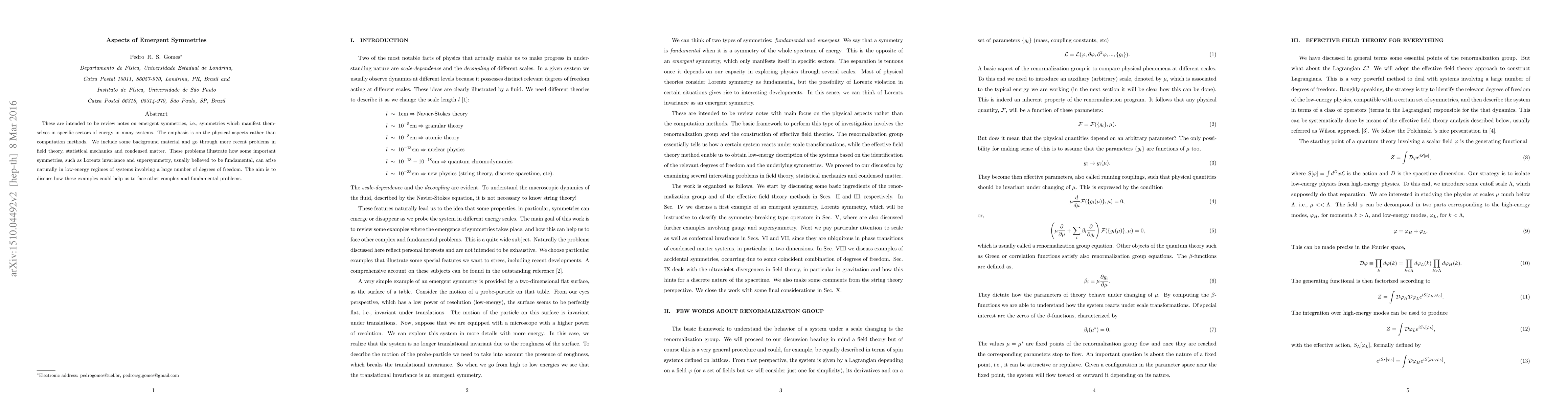 These are intended to be review notes on emergent symmetries, i.e., symmetries which manifest themselves in specific sectors of energy in many systems. The emphasis is on the physical aspects rather than computation methods. We include some background material and go through more recent problems in field theory, statistical mechanics and condensed matter. These problems illustrate how some important symmetries, such as Lorentz invariance and supersymmetry, usually believed to be fundamental, can arise naturally in low-energy regimes of systems involving a large number of degrees of freedom. The aim is to discuss how these examples could help us to face other complex and fundamental problems.