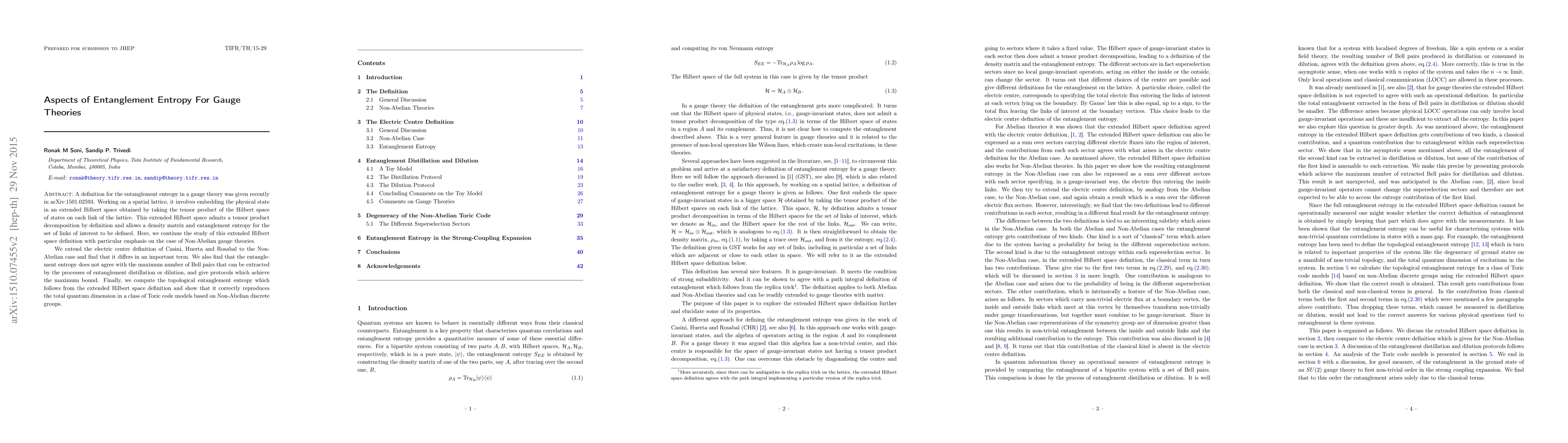 A definition for the entanglement entropy in a gauge theory was given recently in arXiv:1501.02593. Working on a spatial lattice, it involves embedding the physical state in an extended Hilbert space obtained by taking the tensor product of the Hilbert space of states on each link of the lattice. This extended Hilbert space admits a tensor product decomposition by definition and allows a density matrix and entanglement entropy for the set of links of interest to be defined. Here, we continue the study of this extended Hilbert space definition with particular emphasis on the case of Non-Abelian gauge theories. We extend the electric centre definition of Casini, Huerta and Rosabal to the Non-Abelian case and find that it differs in an important term. We also find that the entanglement entropy does not agree with the maximum number of Bell pairs that can be extracted by the processes of entanglement distillation or dilution, and give protocols which achieve the maximum bound. Finally, we compute the topological entanglement entropy which follows from the extended Hilbert space definition and show that it correctly reproduces the total quantum dimension in a class of Toric code models based on Non-Abelian discrete groups.