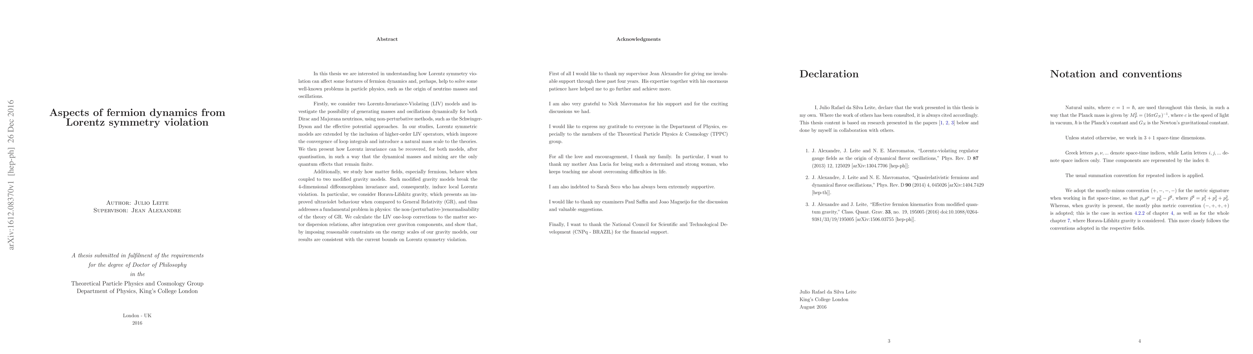 In this thesis we are interested in understanding how Lorentz symmetry violation can affect some features of fermion dynamics and, perhaps, help to solve some well-known problems in particle physics, such as the origin of neutrino masses and oscillations. Firstly, we consider two Lorentz-Invariance-Violating (LIV) models and investigate the possibility of generating masses and oscillations dynamically for both Dirac and Majorana neutrinos, using non-perturbative methods, such as the Schwinger-Dyson and the effective potential approaches. In our studies, Lorentz symmetric models are extended by the inclusion of higher-order LIV operators, which improve the convergence of loop integrals and introduce a natural mass scale to the theories. We then present how Lorentz invariance can be recovered, for both models, after quantisation, in such a way that the dynamical masses and mixing are the only quantum effects that remain finite. Additionally, we study how matter fields, especially fermions, behave when coupled to two modified gravity models. Such modified gravity models break the 4-dimensional diffeomorphism invariance and, consequently, induce local Lorentz violation. In particular, we consider Horava-Lifshitz gravity, which presents an improved ultraviolet behaviour when compared to General Relativity (GR), and thus addresses a fundamental problem in physics: the non-(perturbative-)renormalisability of the theory of GR. We calculate the LIV one-loop corrections to the matter sector dispersion relations, after integration over graviton components, and show that, by imposing reasonable constraints on the energy scales of our gravity models, our results are consistent with the current bounds on Lorentz symmetry violation.