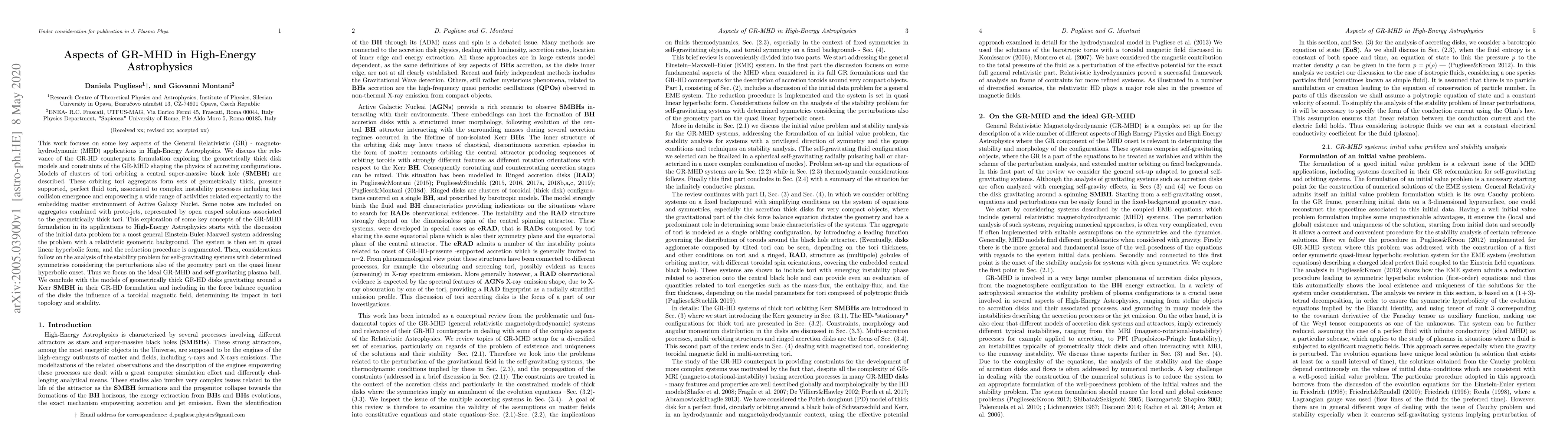 This work focuses on some key aspects of the General Relativistic (GR)-magnetohydrodynamic (MHD) applications in High-Energy Astrophysics. We discuss the relevance of the GR-HD counterparts formulation exploring the geometrically thick disk models and constraints of the GR-MHD shaping the physics of accreting configurations. Models of clusters of tori orbiting a central super-massive black hole (SMBH) are described. These orbiting tori aggregates form sets of geometrically thick, pressure supported, perfect fluid tori, associated to complex instability processes including tori collision emergence and empowering a wide range of activities related expectantly to the embedding matter environment of Active Galaxy Nuclei. Some notes are included on aggregates combined with proto-jets, represented by open cusped solutions associated to the geometrically thick tori. This exploration of some key concepts of the GR-MHD formulation in its applications to High-Energy Astrophysics starts with the discussion of the initial data problem for a most general Einstein-Euler-Maxwell system addressing the problem with a relativistic geometric background. The system is then set in quasi linear hyperbolic form, and the reduction procedure is argumented. Then, considerations follow on the analysis of the stability problem for self-gravitating systems with determined symmetries considering the perturbations also of the geometry part on the quasi linear hyperbolic onset. Thus we focus on the ideal GR-MHD and self-gravitating plasma ball. We conclude with the models of geometrically thick GR-HD disks gravitating around a Kerr SMBH in their GR-HD formulation and including in the force balance equation of the disks the influence of a toroidal magnetic field, determining its impact in tori topology and stability