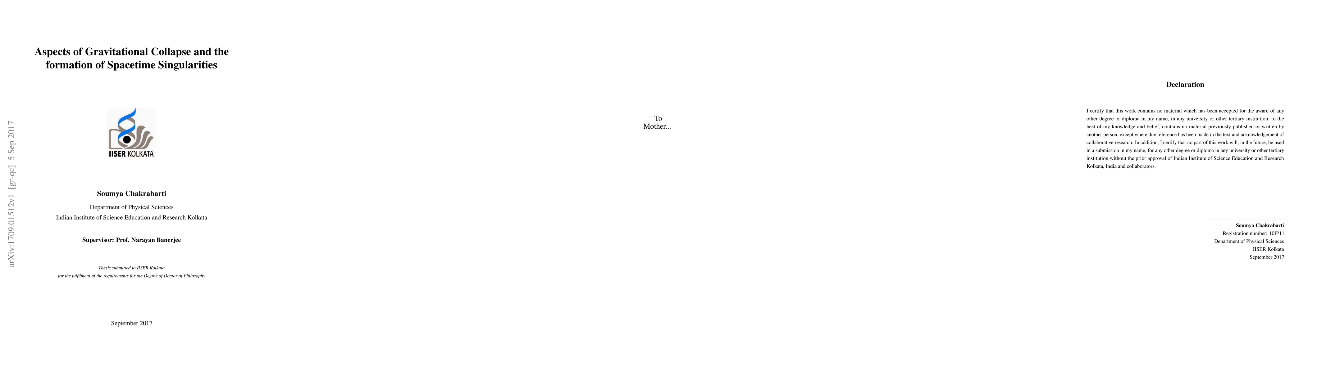 Possibilities emerging out of the dynamical evolutions of collapsing systems are addressed in this thesis through analytical investigations of the highly non-linear Einstein Field Equations. Studies of exact solutions and their properties, play a non-trivial role in general relativity, even in the current context. Finding non-trivial solutions to the Einstein field equations requires some reduction of the problem, which usually is done by exploiting symmetries or other properties. Exact solutions of the Einsteins field equations describing an unhindered gravitational collapse are studied which generally predict an ultimate singular end-state. In the vicinity of such a spacetime singularity, the energy densities, spacetime curvatures, and all other physical quantities blow up. Despite exhaustive attempts over decades, the famous conjecture that the formation of a singularity during stellar collapse necessarily accompanies the formation of an event horizon, thereby covering the central singularity, still remains without a proof. Moreover, there are examples of stellar collapse models with reasonable matter contribution in which an event horizon does not form at all, giving rise to a naked singularity from which both matter and radiation can fall in and come out. These examples suggest that the so-called cosmic censorship conjecture may not be a general rule. Therefore one must embark upon analysis of realistic theoretical models of gravitational collapse and gradually generalizing previous efforts.